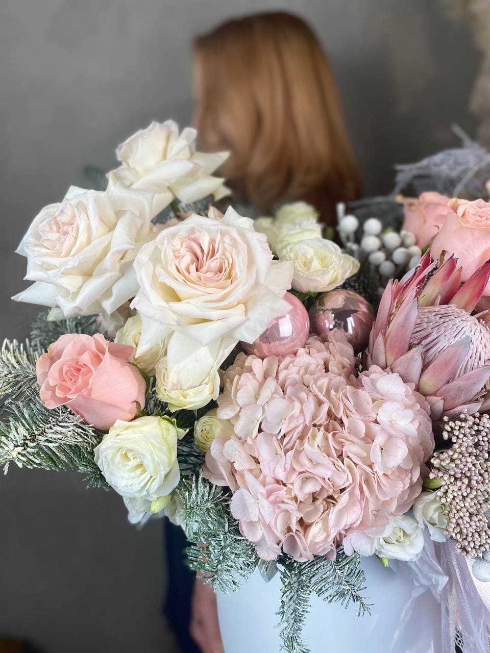 датский нобилис, гортензия, протея, хамелациум, пионовидные кустовые розы, аспарагус, эвкалипт, бруния, набор ёлочных украшений, цилиндр Готовая композиция может иметь незначительные внешние отличия от примера на фотографии, вместе с тем, сохранит гамму и фактуру.