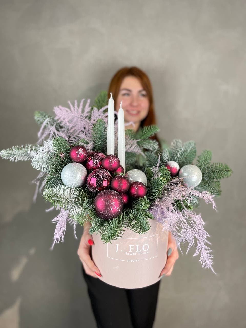 живая ель (датский нобилис), новогодние игрушки, аспарагус, свечи, декор, оазис, бокс D20-25 см Готовая композиция может иметь незначительные внешние отличия от примера на фотографии.