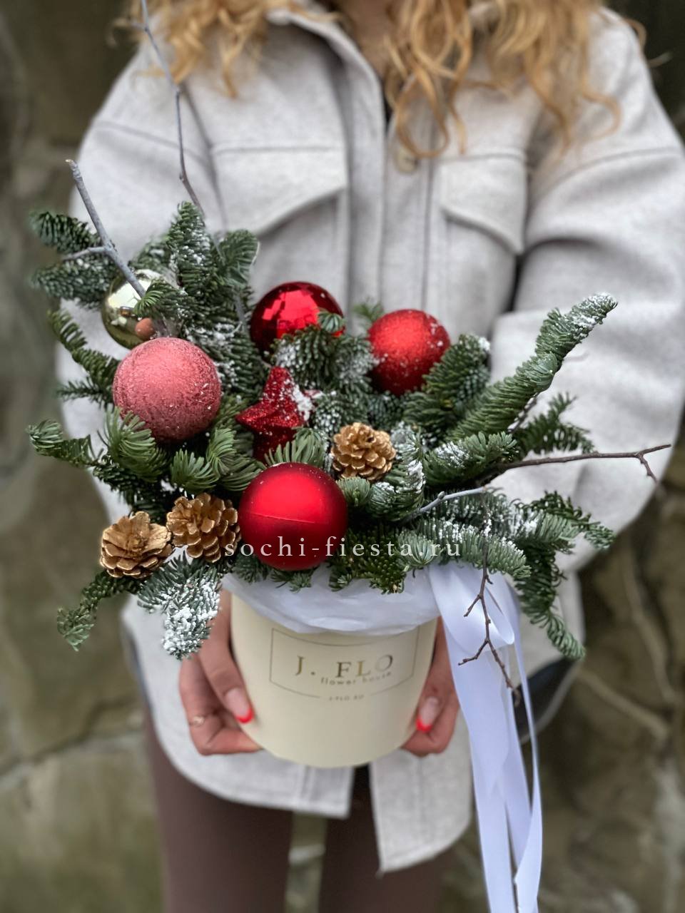 Датский нобилис в красной коробке собран плотно и графично. Шишки и праздничные игрушки создают объём и заполняют пространство между ветками. Композиция держит форму и выглядит завершённой.