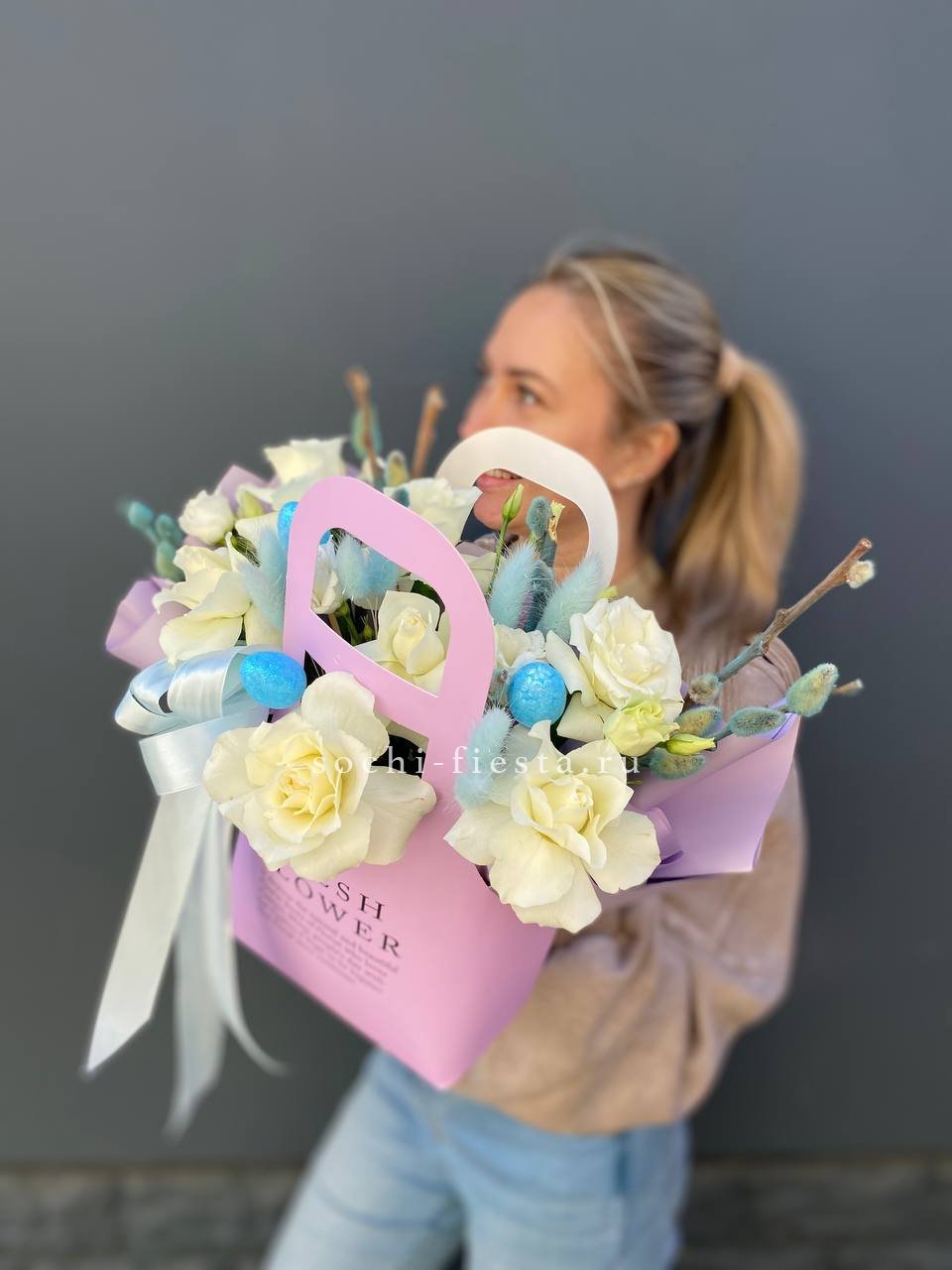 белые розы, верба, лагурус, эвкалипт, яица, сумочка.