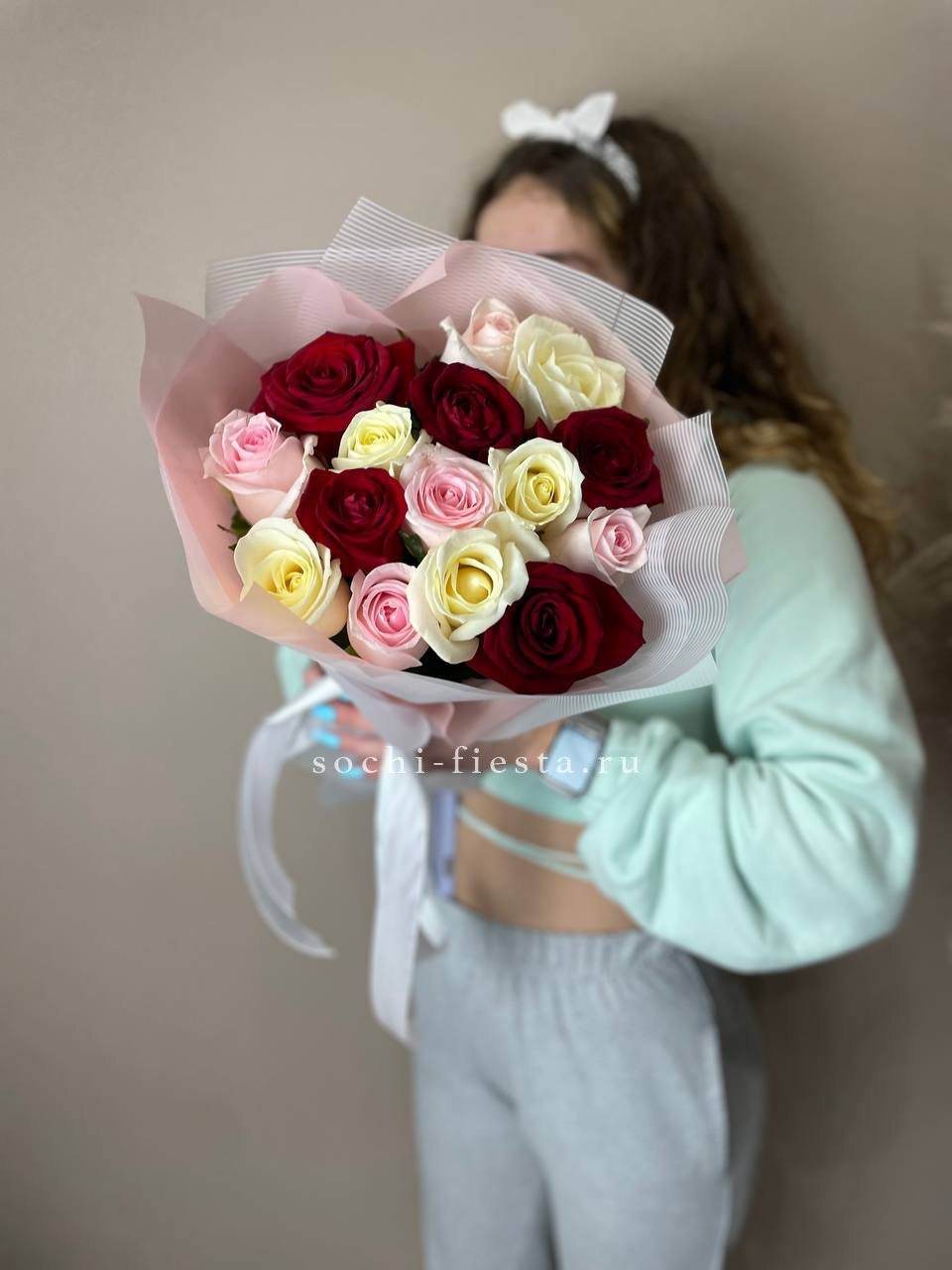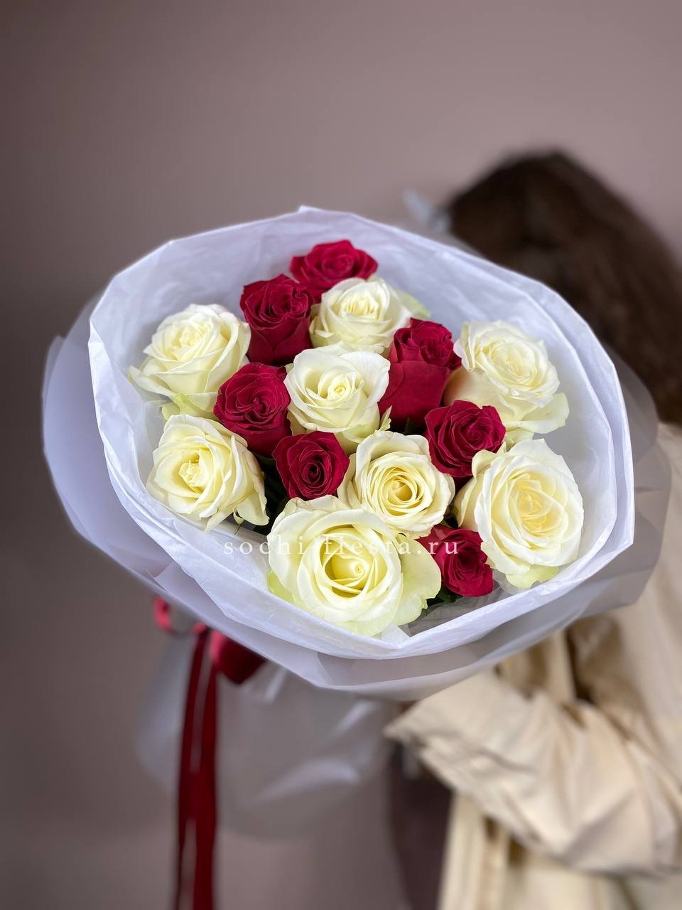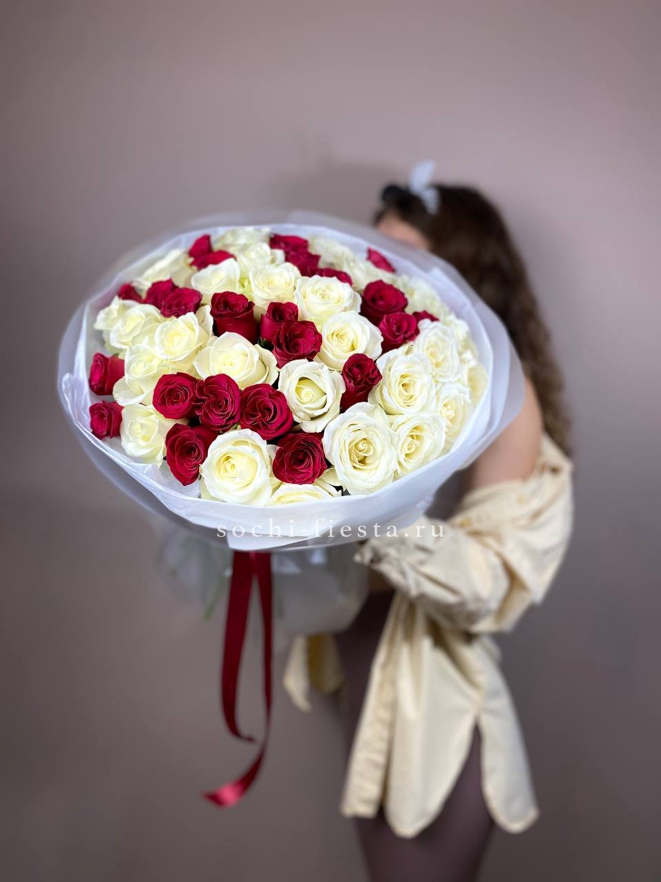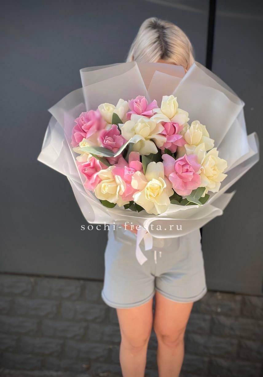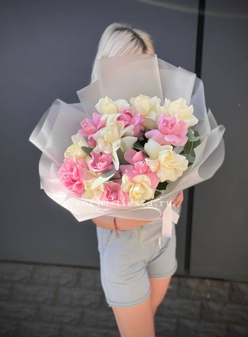 Мягкая игра оттенков между белым и розовым создает объемную глубину букета. Пятьдесят один бутон выстраивается в плотную структуру, где каждый цвет усиливает звучание соседнего без резких границ.