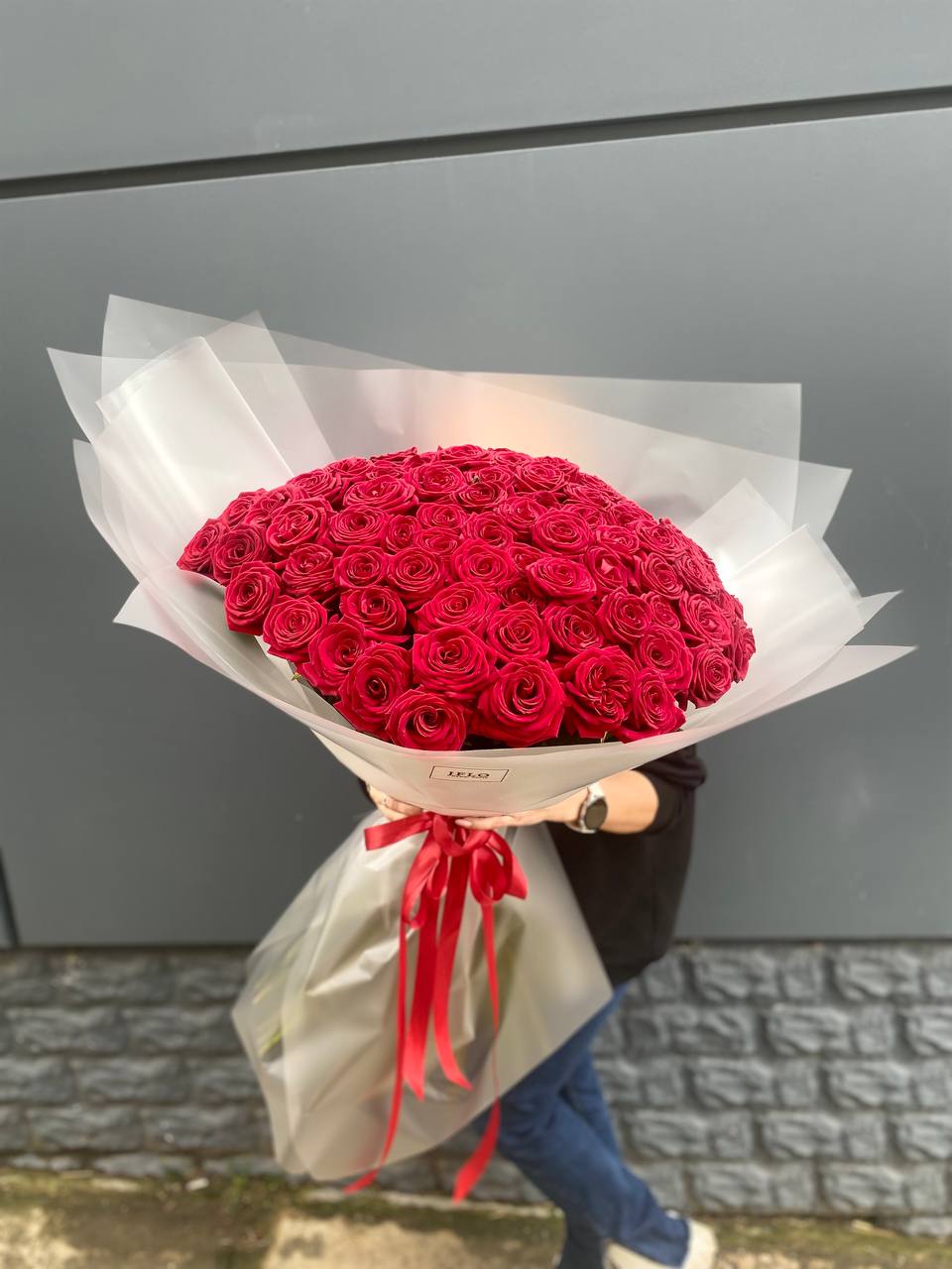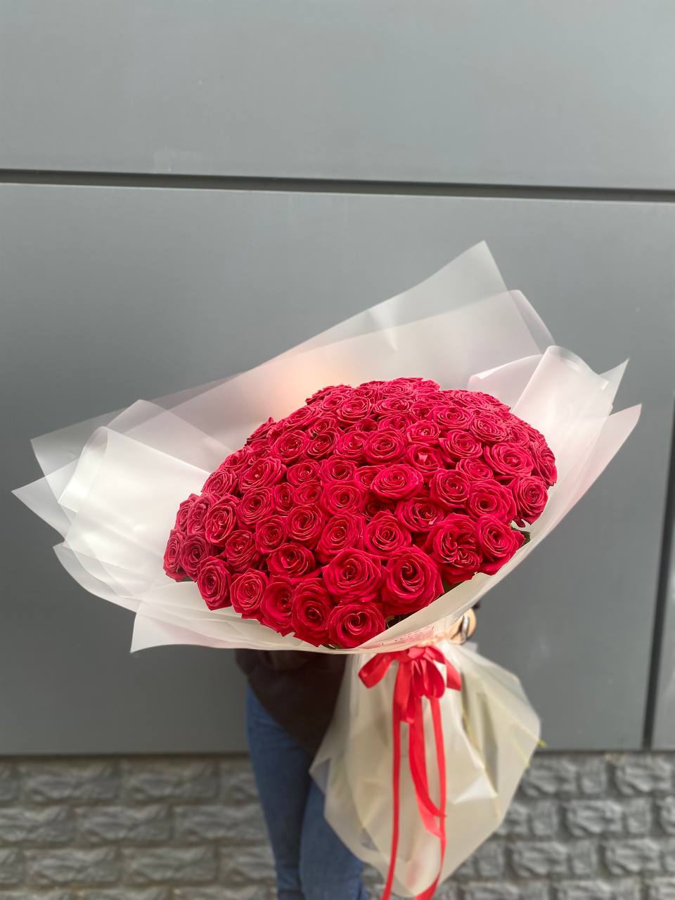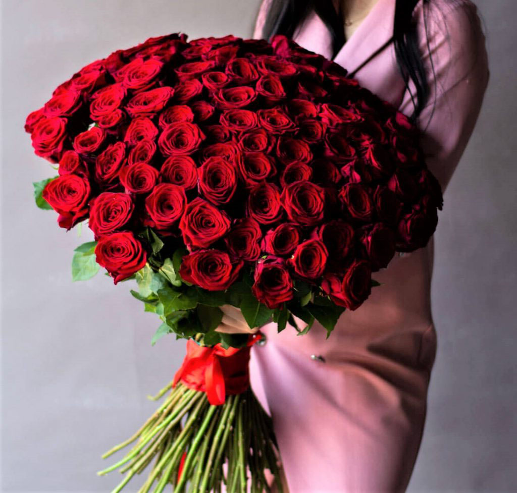 Сто одна роза в плотной охапке создает объемное облако цвета и движения. Розовый оттенок наполняет пространство мягким свечением, а высота букета позволяет ему доминировать в любом интерьере.