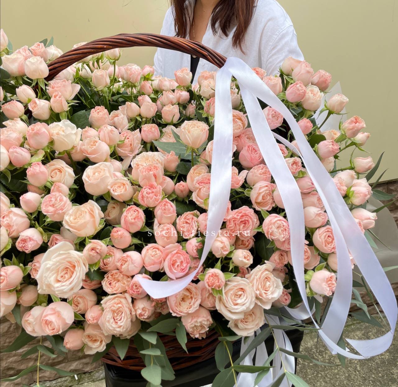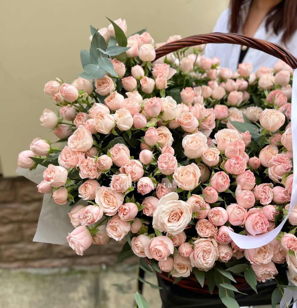 Сто один бутон Бомбастик укладывается плотными кругами в просторную корзину. Эвкалипт обрамляет композицию свежей зеленью, а пышные головки роз формируют мягкую волнистую поверхность.