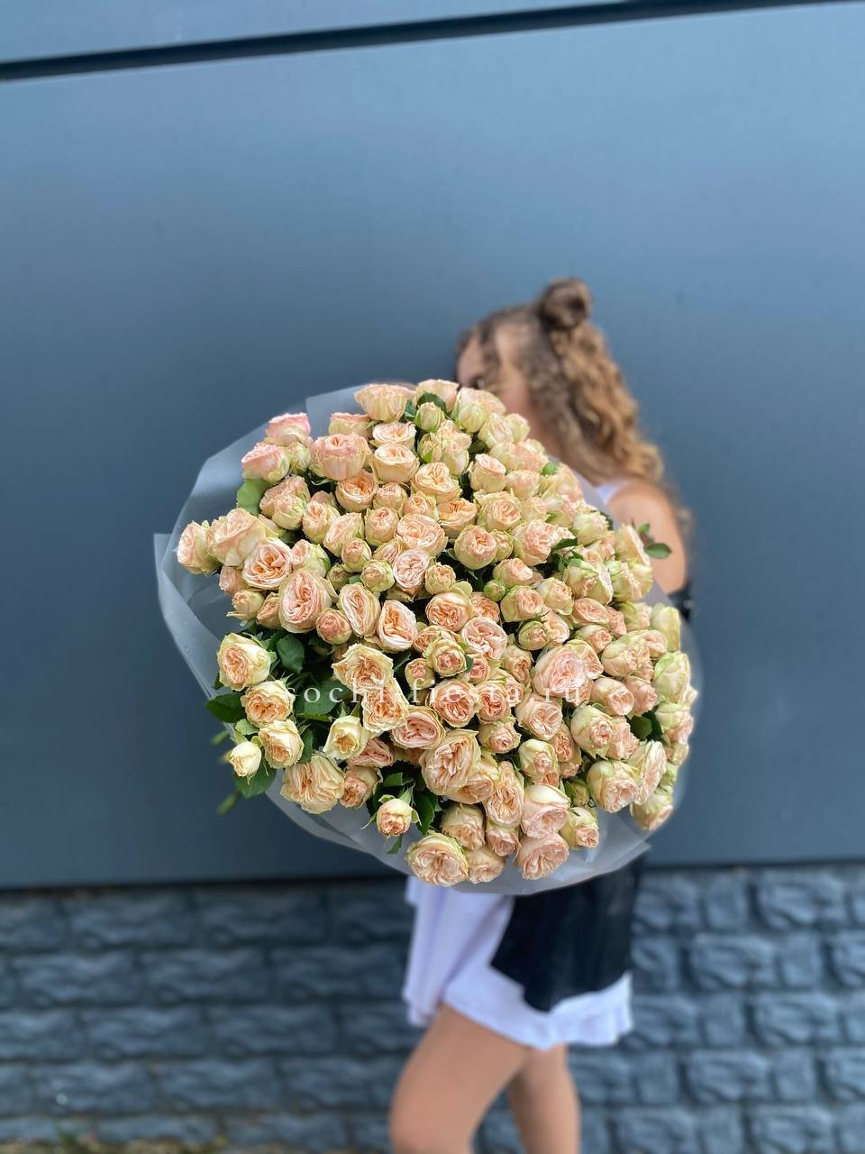 Пятьдесят один бутон образует масштабную композицию, которая притягивает внимание и заполняет пространство. Пионовидные розы создают впечатление цветочного облака с мягкими переливами оттенков.