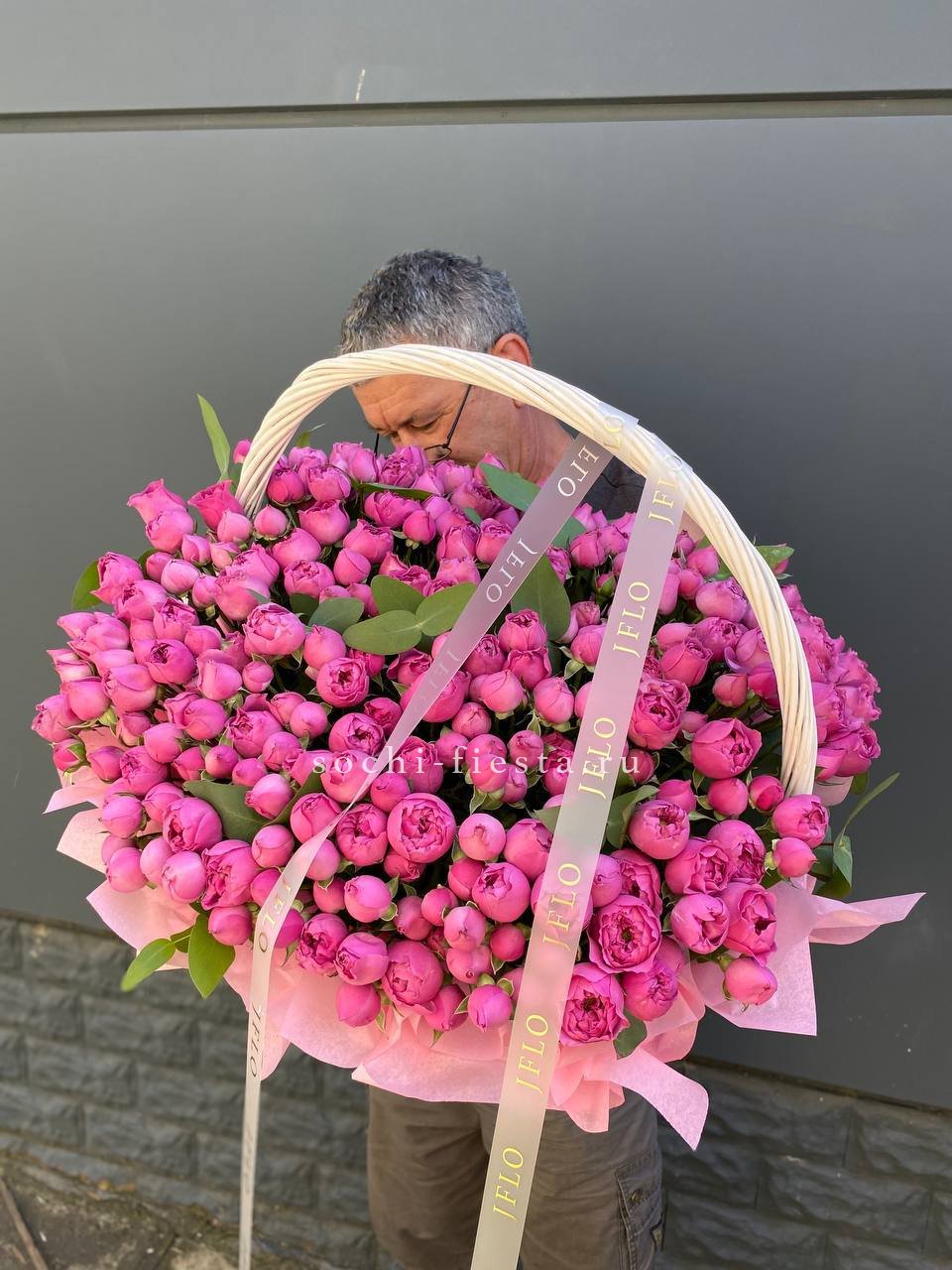 Сто одна роза сорта Мисти Баблс собрана в плетёную корзину светлого оттенка. Плотное заполнение создаёт цветочное облако с мягкими переливами лавандовых и кремовых тонов. Композиция занимает пространство и притягивает внимание.