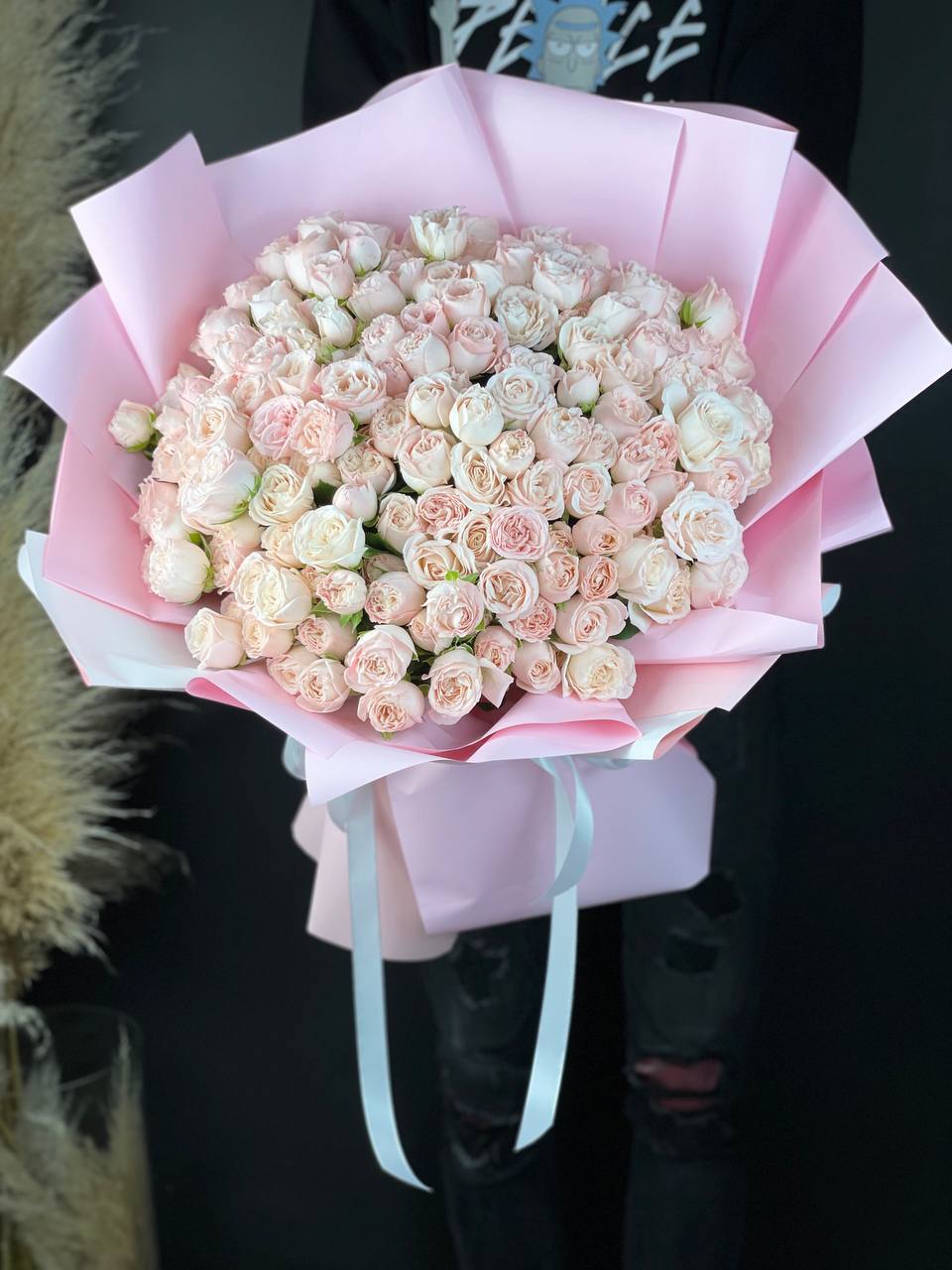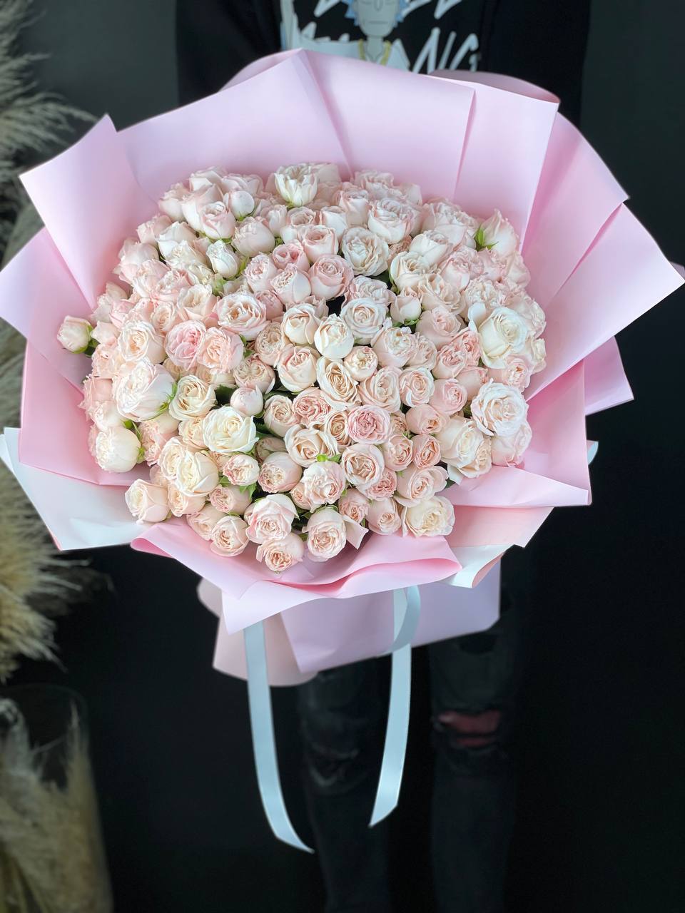 Пятнадцать кустовых роз собраны в плотную округлую форму. Мелкие бутоны создают воздушную текстуру и мягкий объём в пространстве.