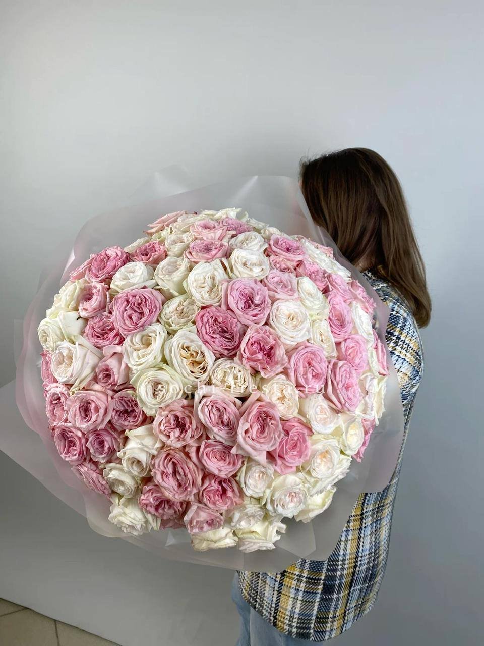 Сто один бутон сорта O'Hara собраны в пышную композицию с многослойными лепестками и густой текстурой. Это масштабное решение для значимых событий и ярких эмоций.