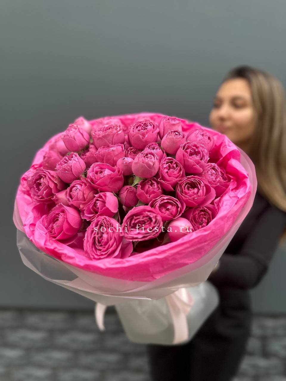 Двадцать пять пионовидных роз в плотной округлой форме создают объёмное облако нежно-розового оттенка. Сорт Pink X-Pression с густомахровыми бутонами собран под ленту без дополнительного декора.