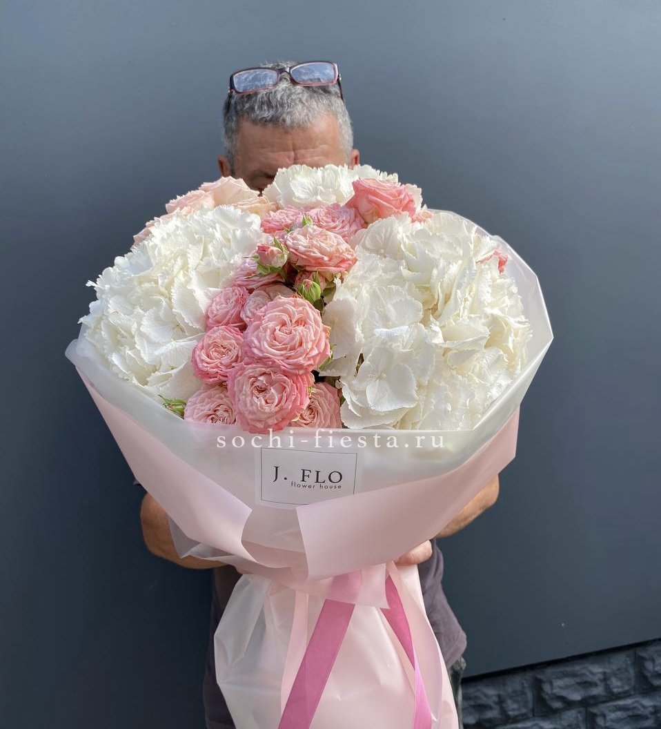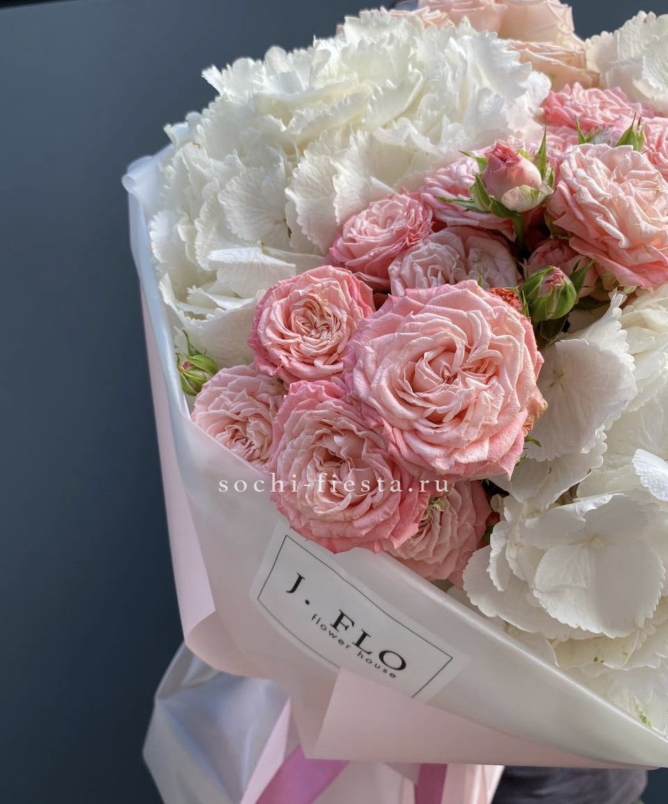Кустовые розы и гортензия собраны в плотный объём с мягкими переходами оттенков. Композиция держит форму и выглядит цельно благодаря продуманной сборке. Подходит для интерьеров в пастельной гамме.