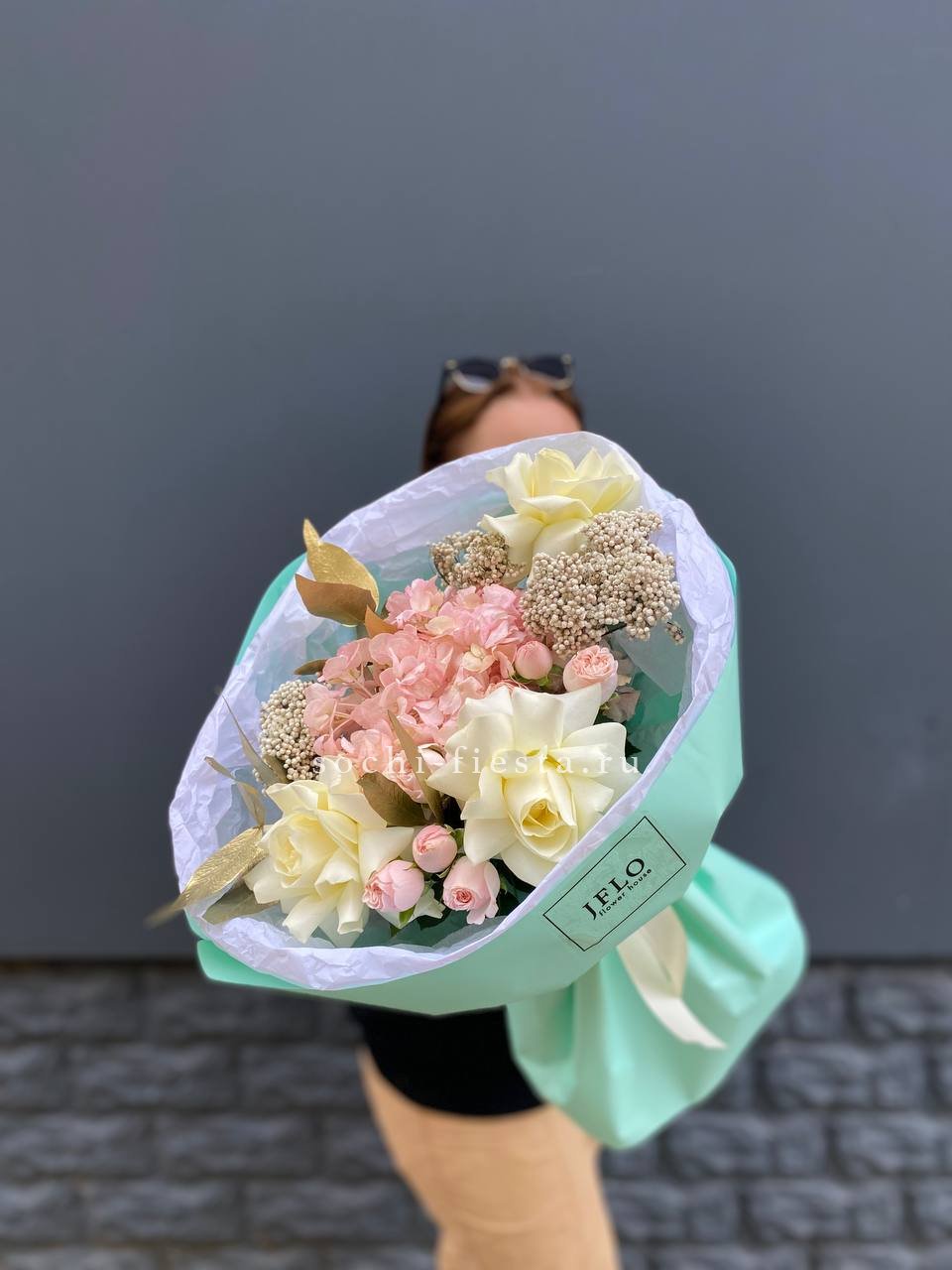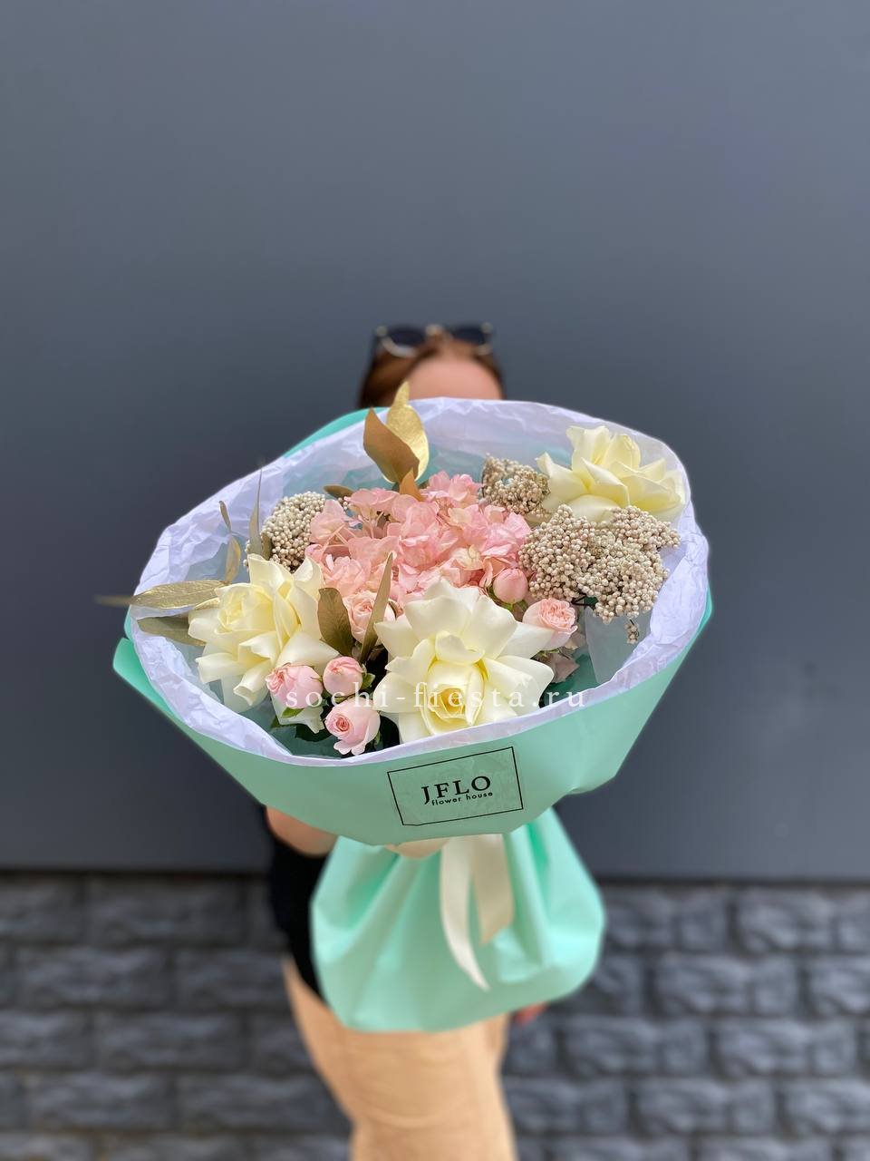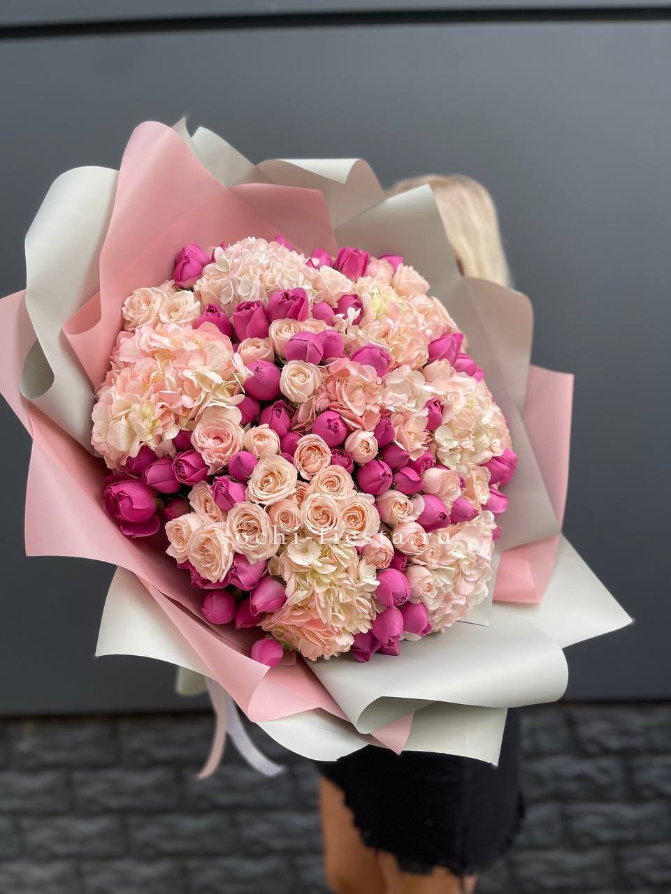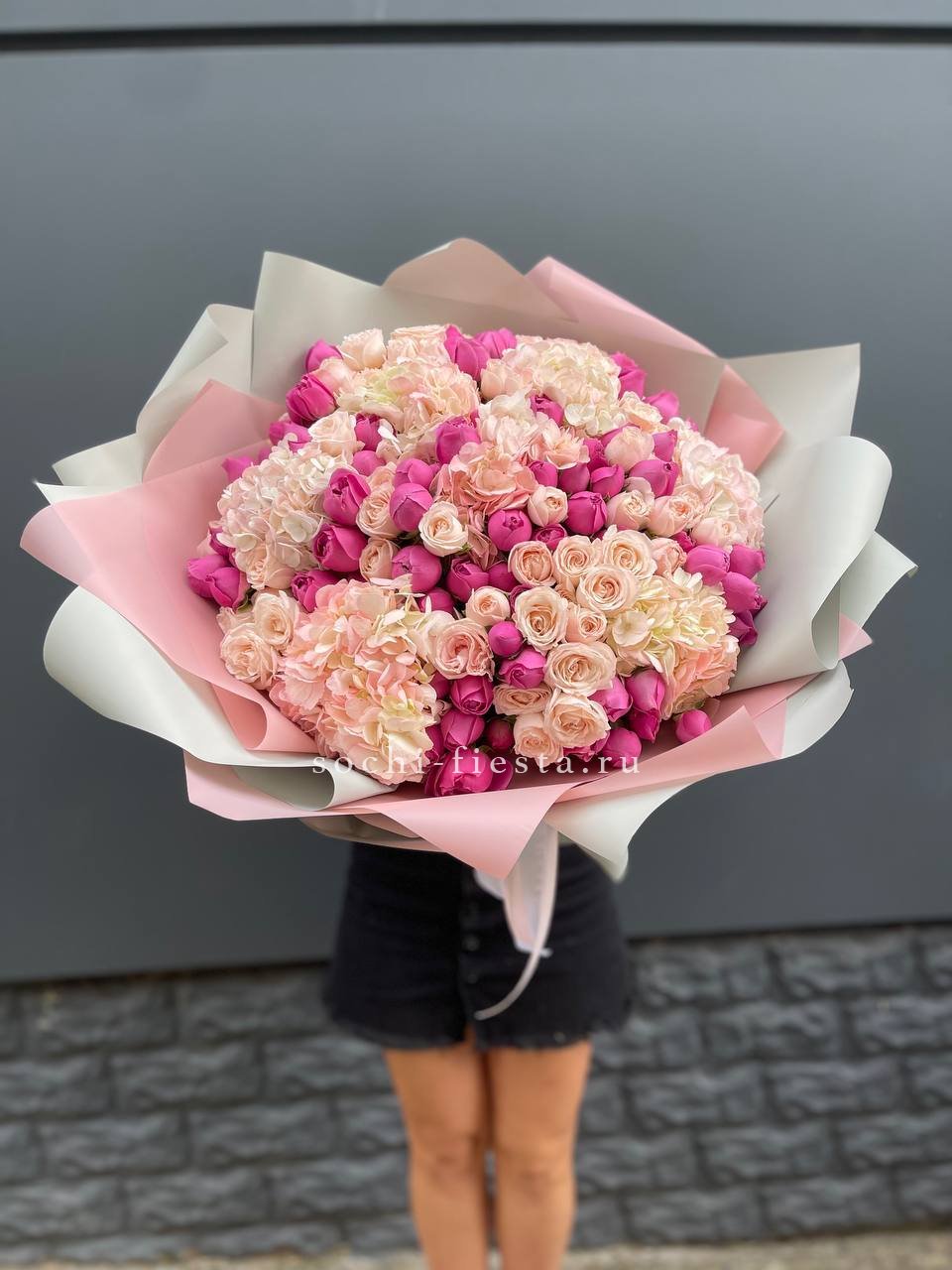 гортензия, розовые розы, диантусы, эустома, маттиолы, эвкалипт лента и дизайнерская пленка.