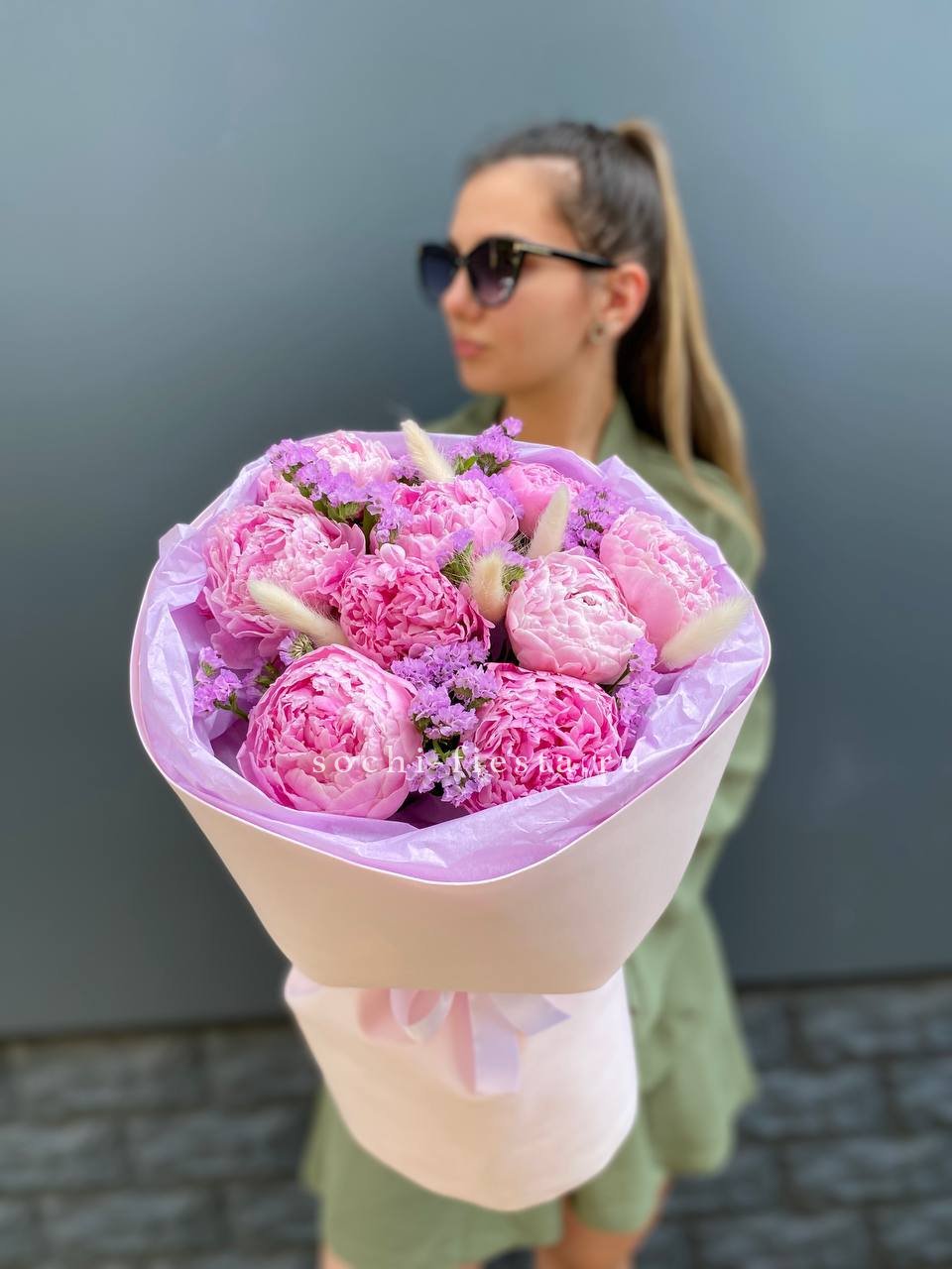 Крупные бутоны пионов окружены воздушными метёлками лагуруса и мелкими соцветиями статицы. Композиция собрана с акцентом на естественную лёгкость и свободное движение линий.