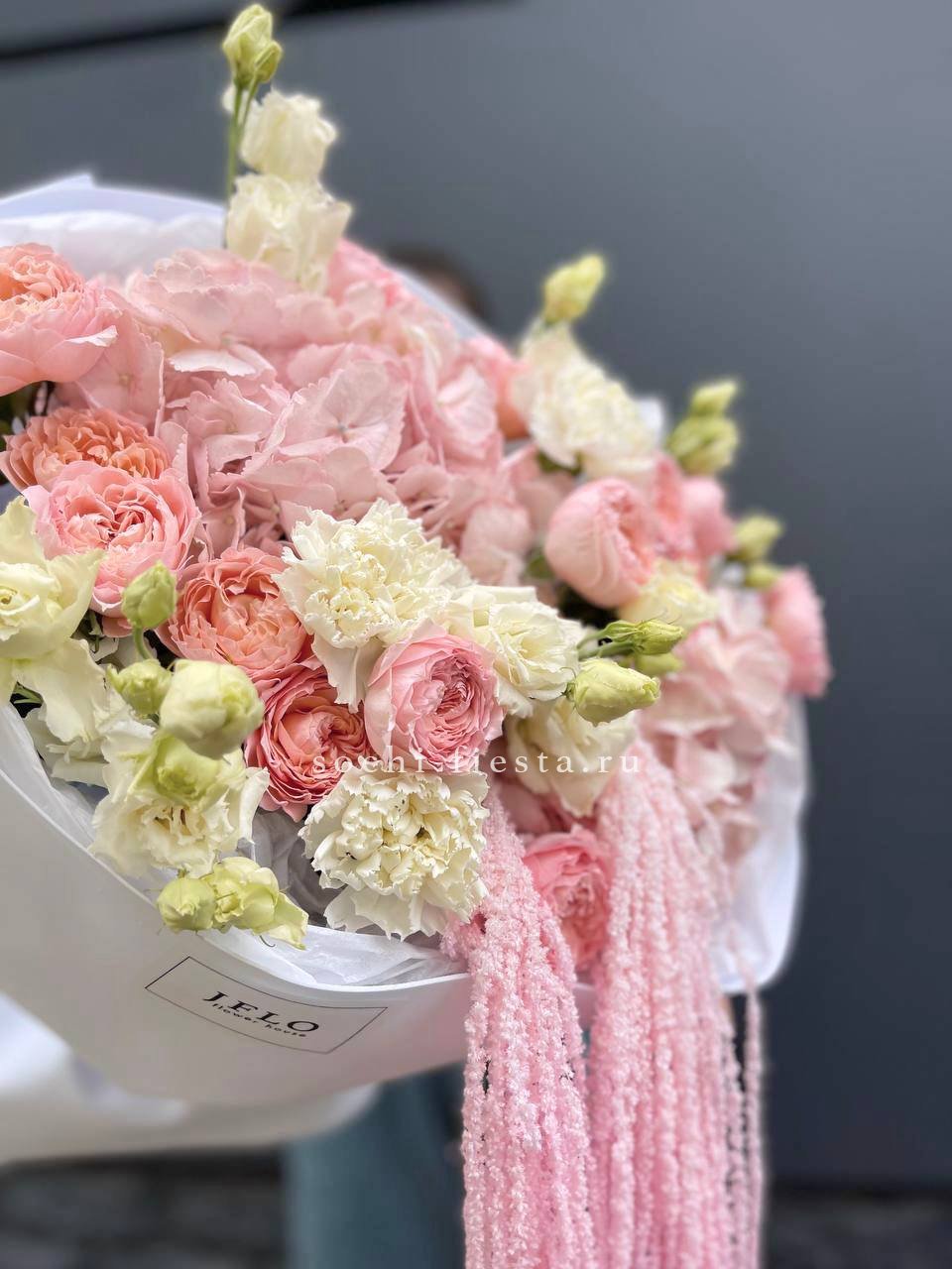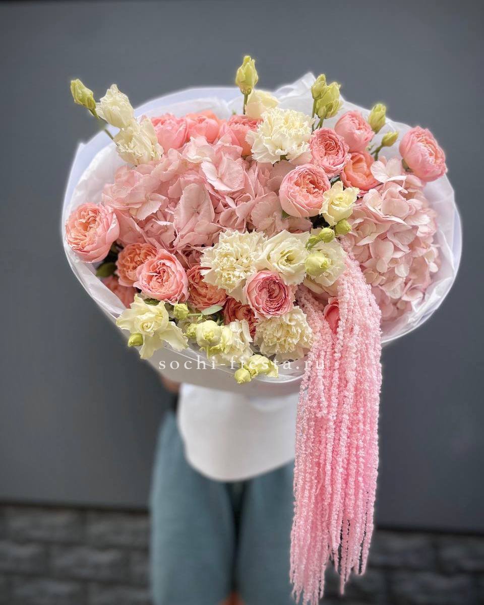 кустовые розы, гортензии, диантусы, эустома, амарант, лента и дизайнерская пленка.