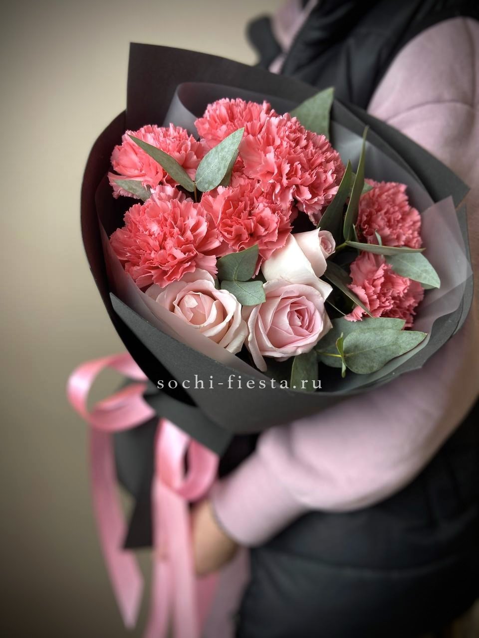 розовые розы, эустома, лента, упаковка.