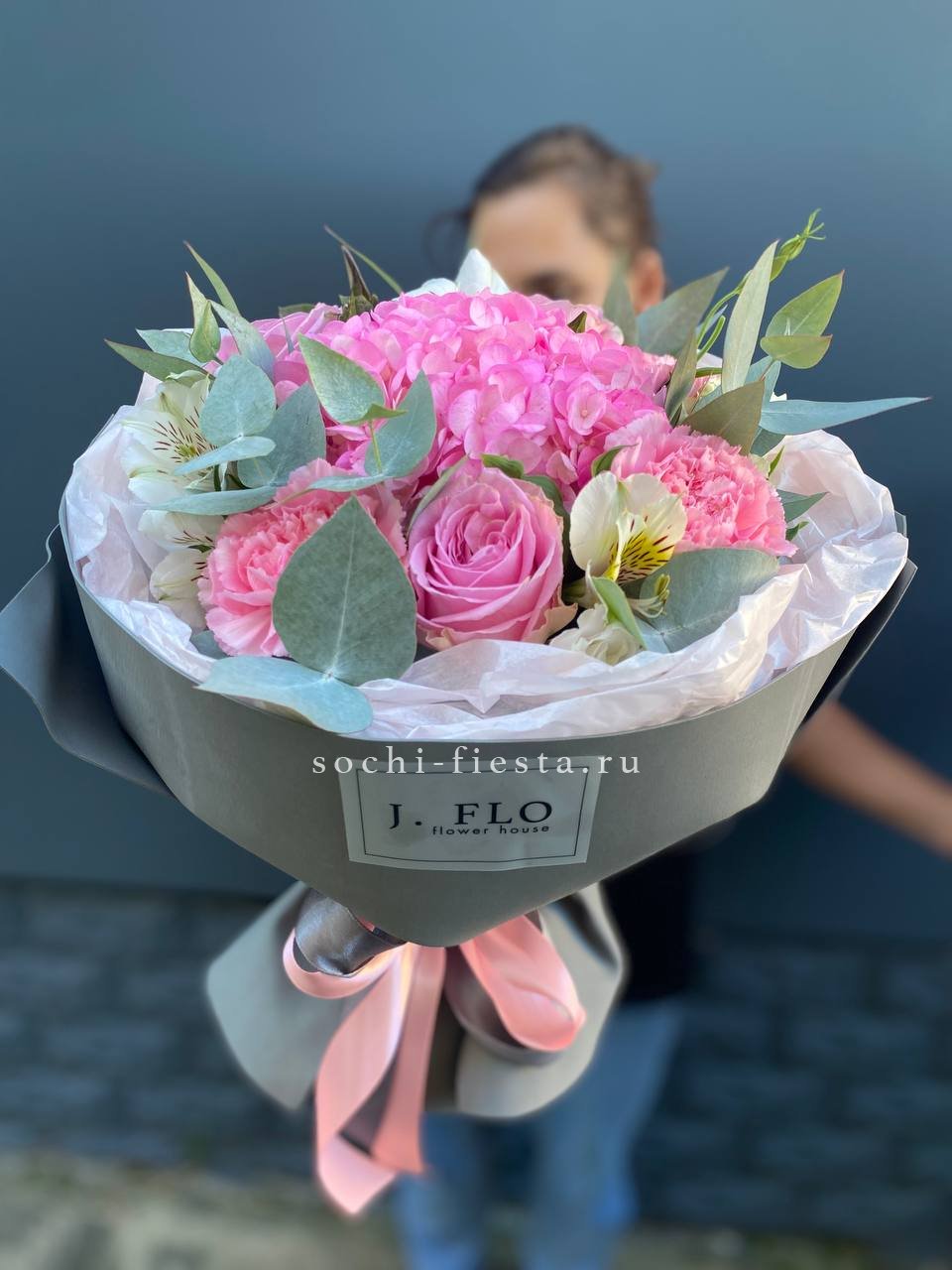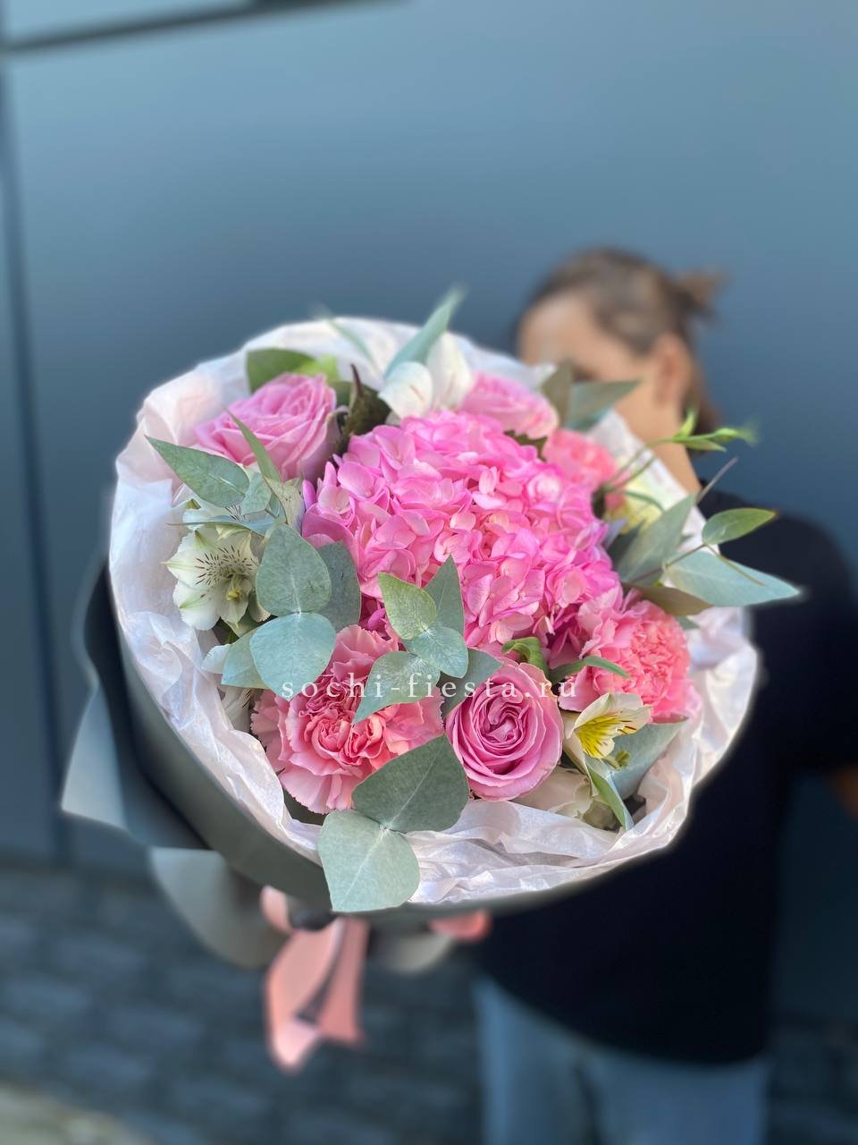 Плотная сборка с пышными соцветиями гортензии и яркими герберами создает объемный силуэт. Маттиола и лимониум добавляют воздушности по краям, а диантусы заполняют центр мягкими переходами.
