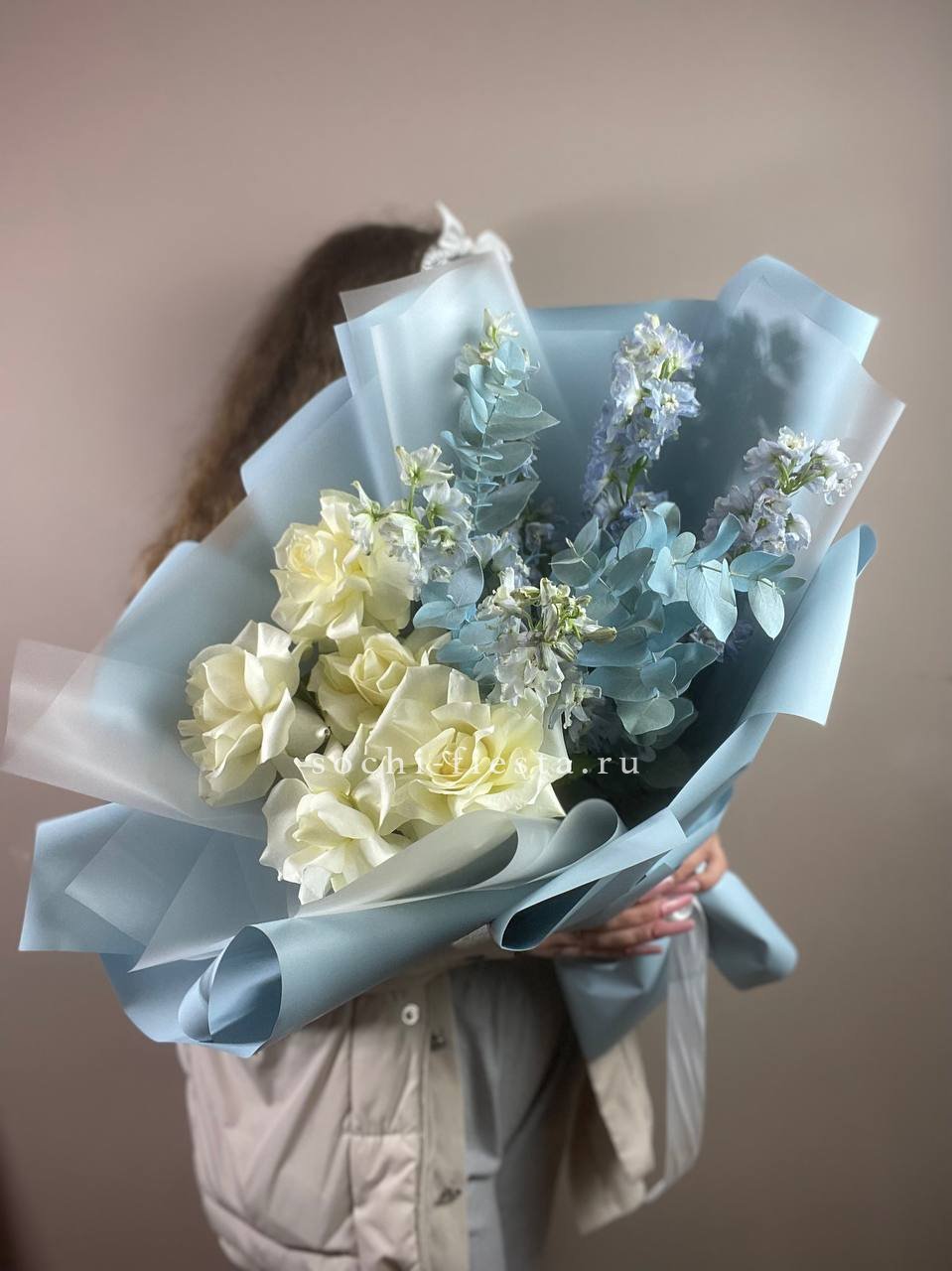вывернутые розы, дельфиниум, эвкалипт, лента, авторская упаковка.