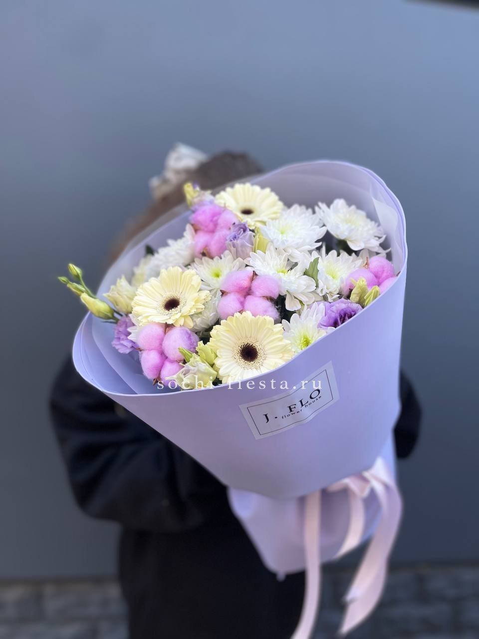 Герберы и хризантемы выстраивают яркую композицию, где каждый бутон читается отдельно. Хлопок добавляет фактурный акцент, а эустома смягчает переходы между соцветиями.