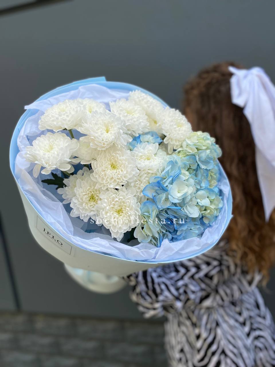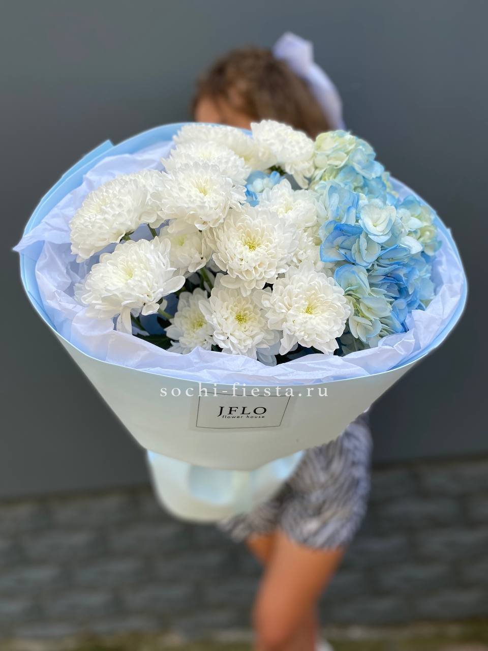 Французские розы и кустовые хризантемы собраны в букет с плотной текстурой и мягким переходом оттенков. Композиция держит форму и долго сохраняет свежесть.