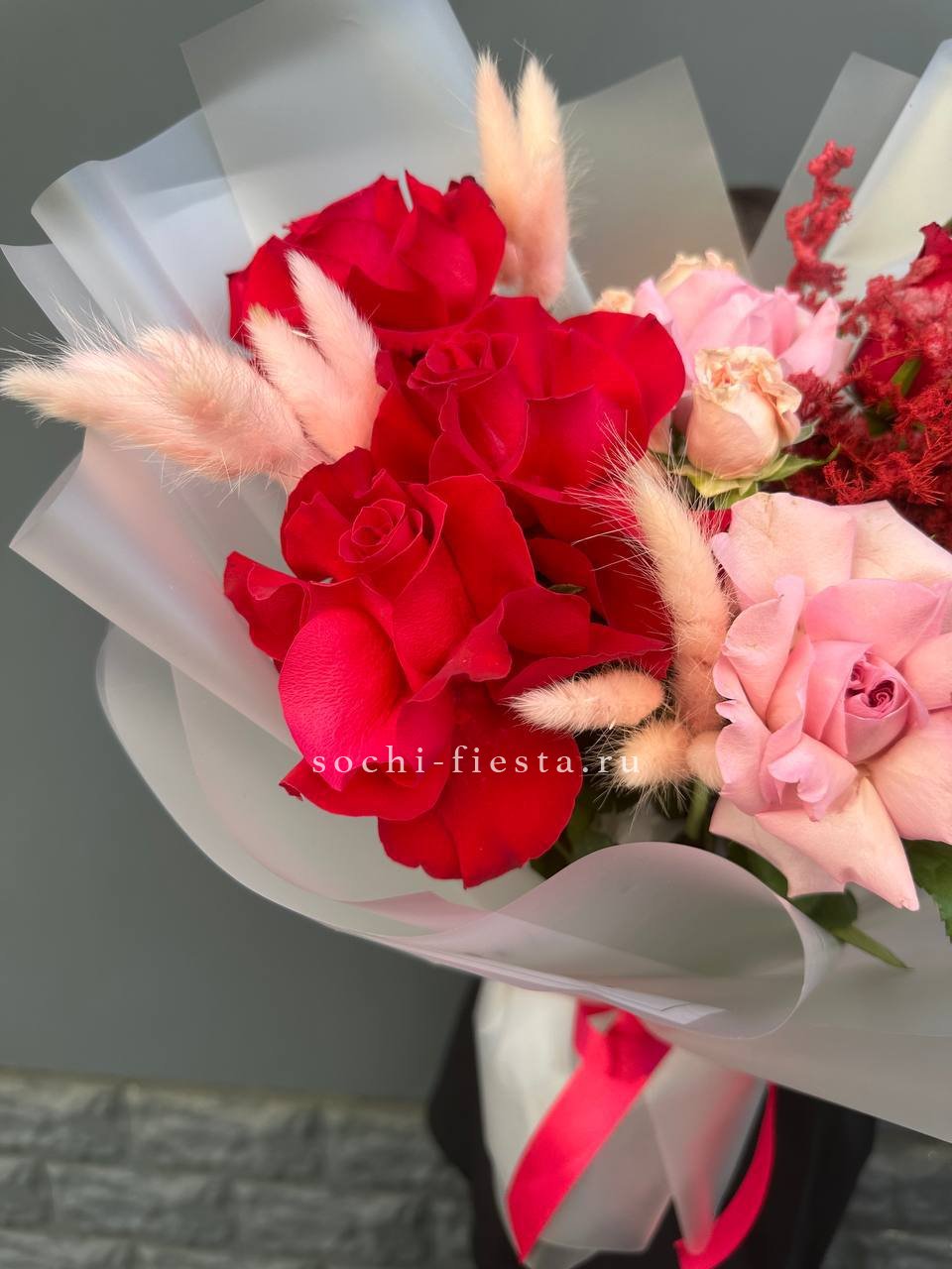 Красные и розовые оттенки переплетаются с цветущими ветками и пушистым лагурусом. Аспарагус добавляет воздушности, а кустовые розы заполняют пространство живой энергией. Букет держит форму и притягивает взгляд.