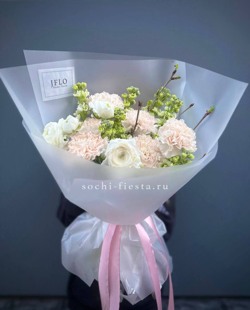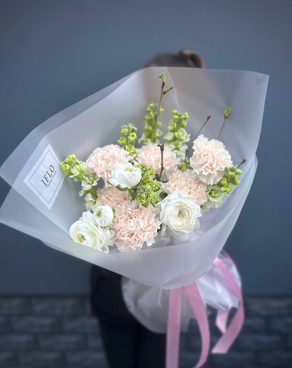 Душистая маттиола и многослойные ранункулюсы собраны в пышную композицию с цветущими ветками. Диантусы добавляют воздушности, а матовое оформление завершает образ.