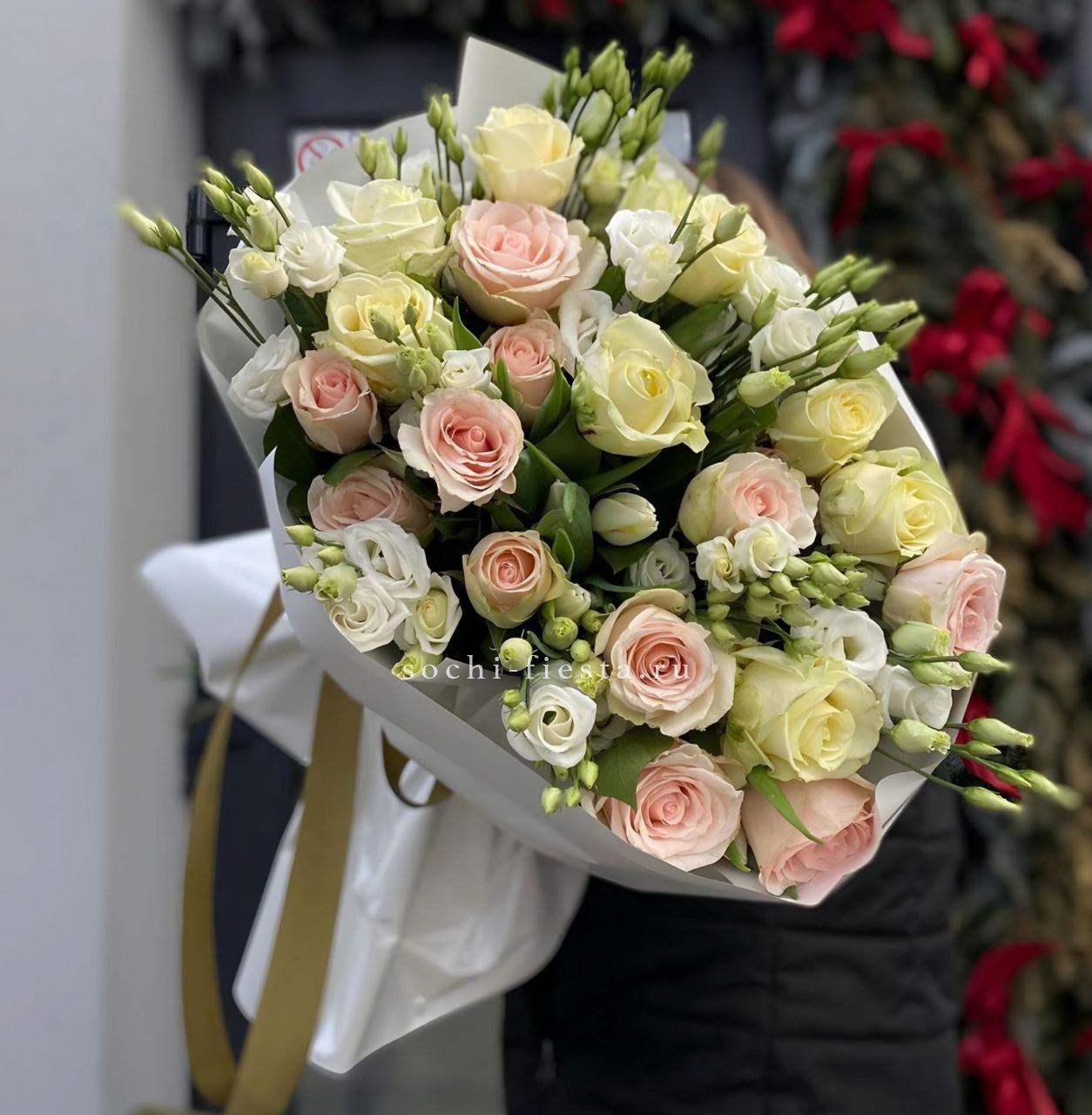 кустовые розы, гортензии, французские розы, диантусы, эустомы, лента и дизайнерская пленка.