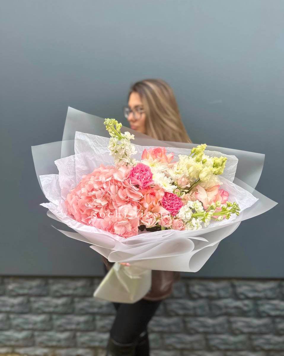 гортензия, пионы, кустовые пионовидные розы, одноголовые розы, дельфиниум (или аналог вне сезона), лента, дизайнерская упаковка.