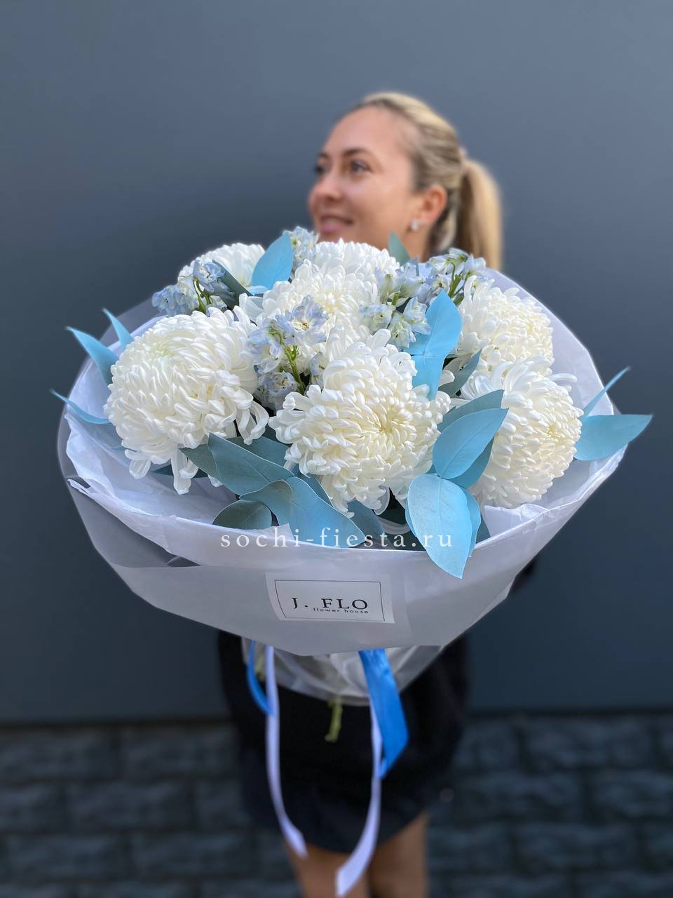 хризантема Бигуди, эвкалипт, дельфиниум, лента, дизайнерская упаковка.