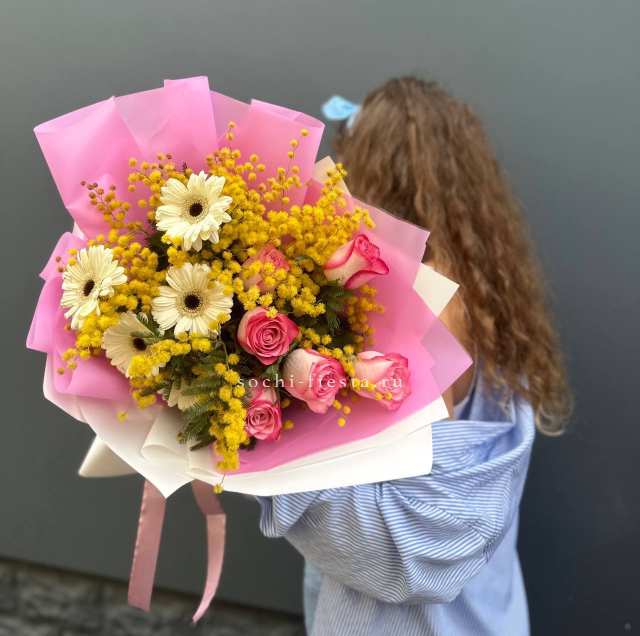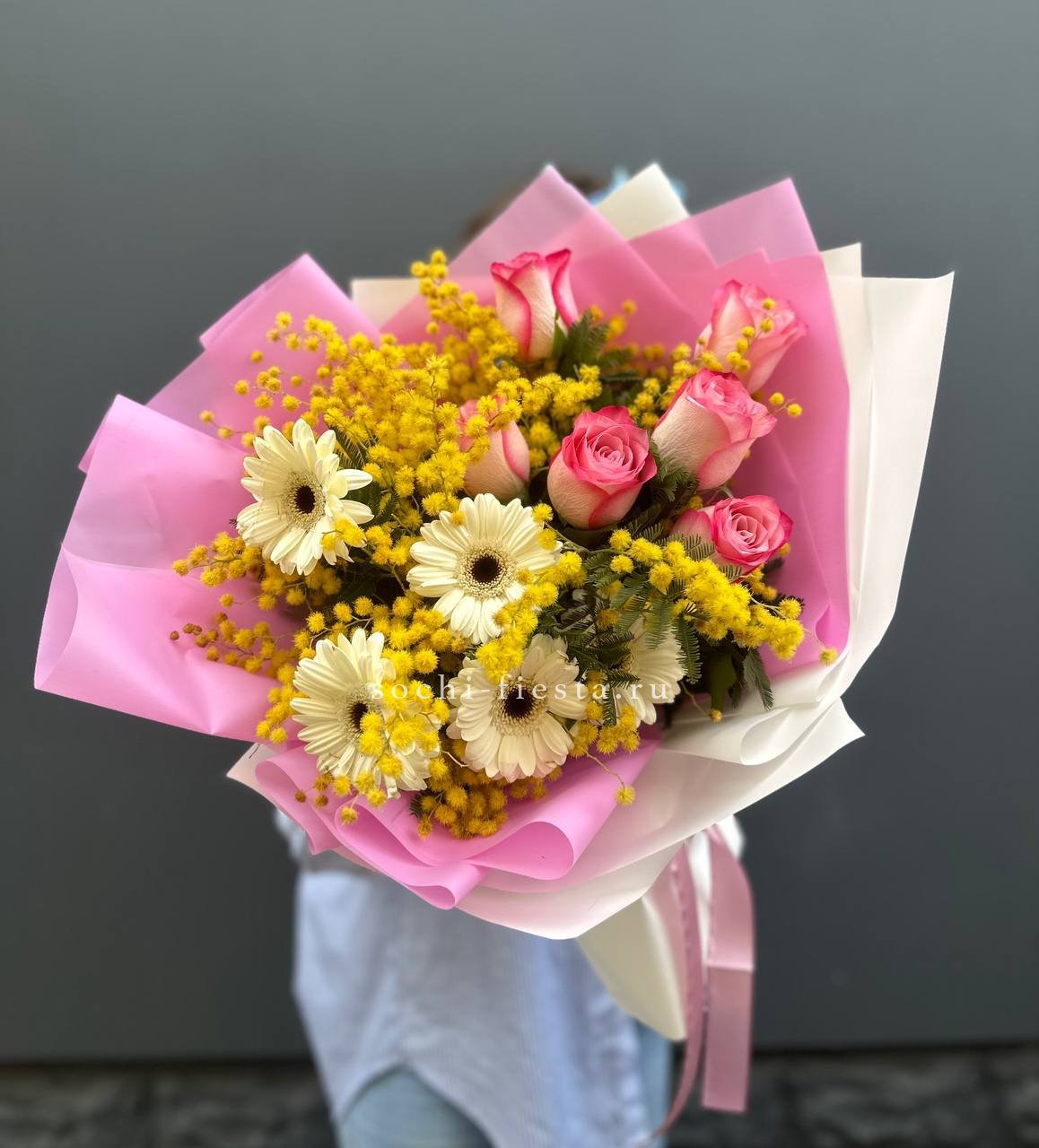 мимоза, герберы, розы Венди.