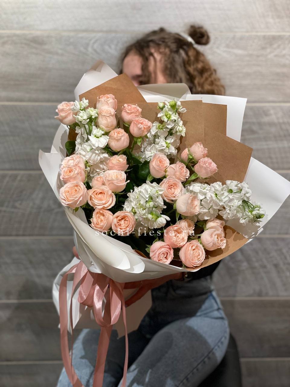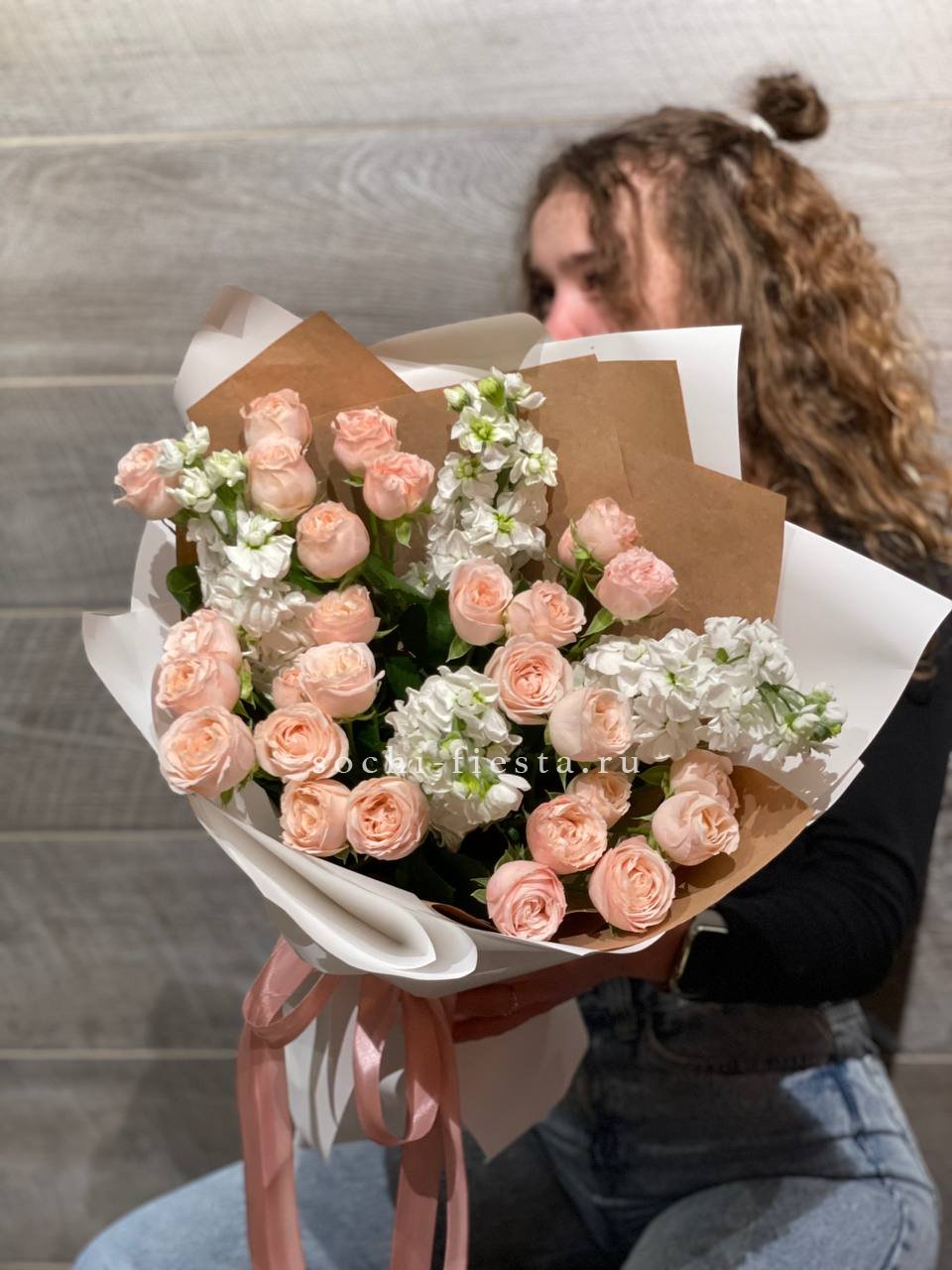 Розы сорта Бомбастик раскрываются густыми лепестками, формируя плотную текстуру с объёмной сердцевиной. Маттиола вносит мягкость и дополняет композицию лёгким ритмом.