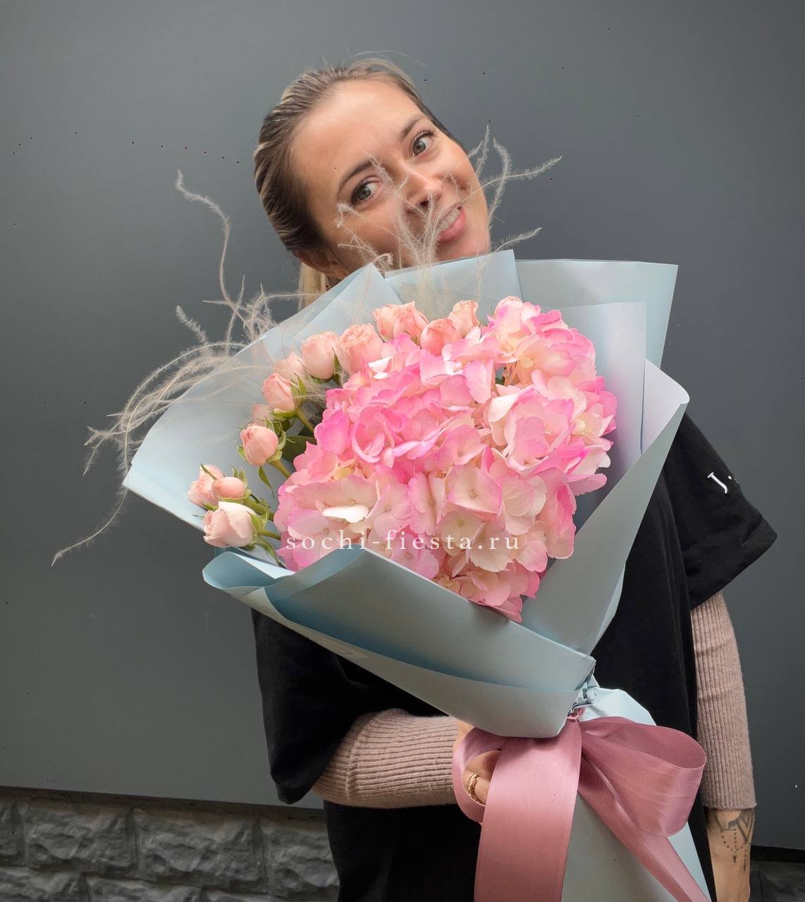 гербера, диантус, гортензия, бомбамстик, озатамус в нежном оформлении.