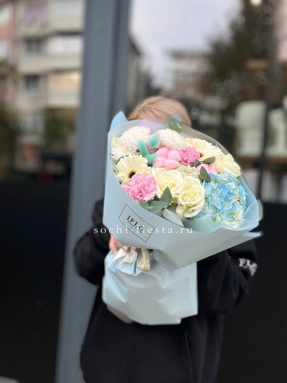 Яркие герберы встречаются с розами и хризантемами в плотной композиции. Гортензия добавляет объём, а хлопок создаёт мягкую текстурную волну по краю букета.