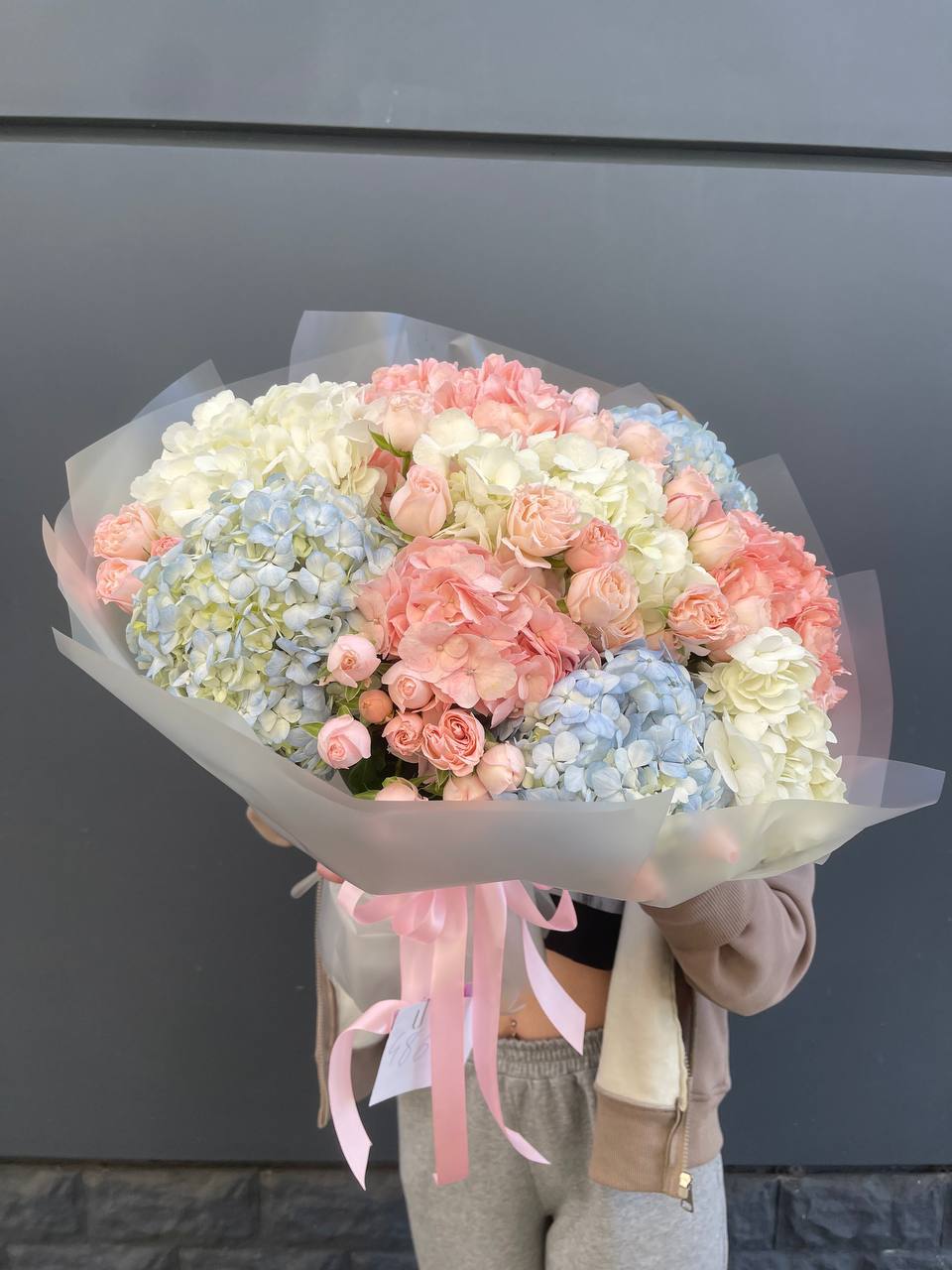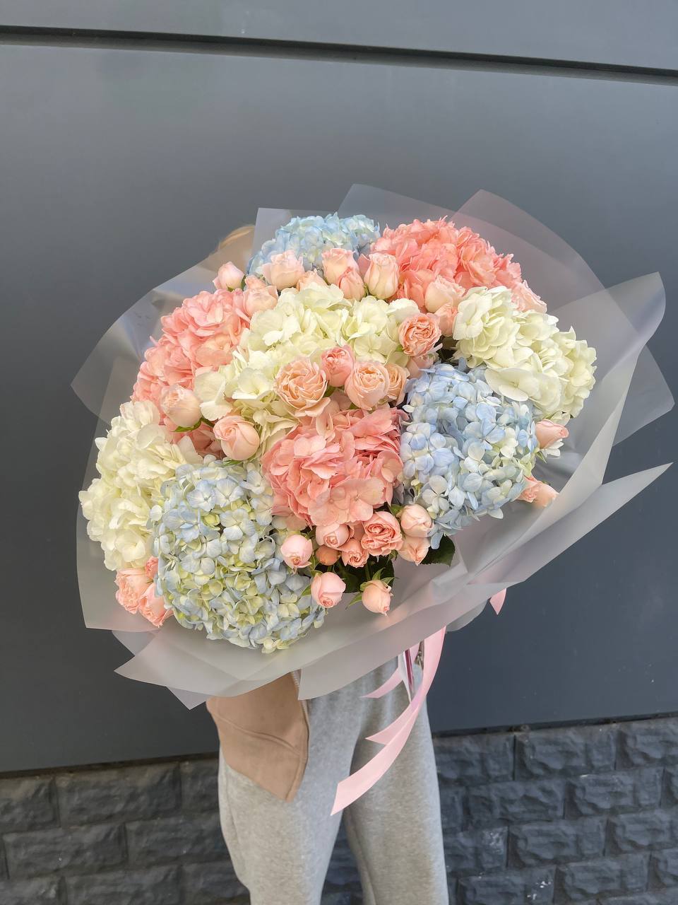 роза одноголовая, кустовая роза, альстромерия, гортензия, эустома, эвкалипт, декоративная зелень, лента, крафт.