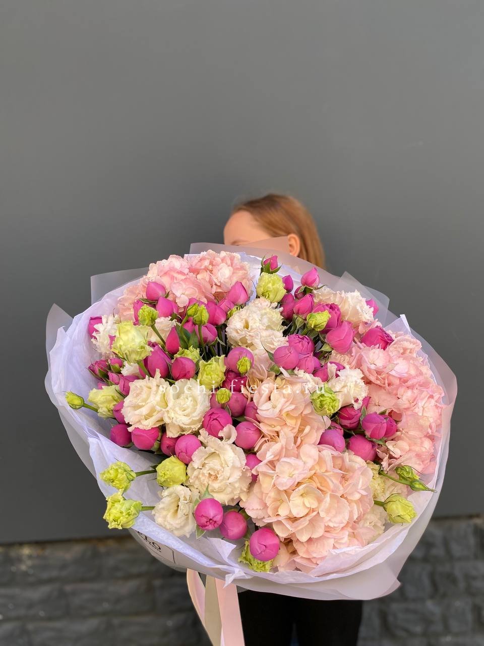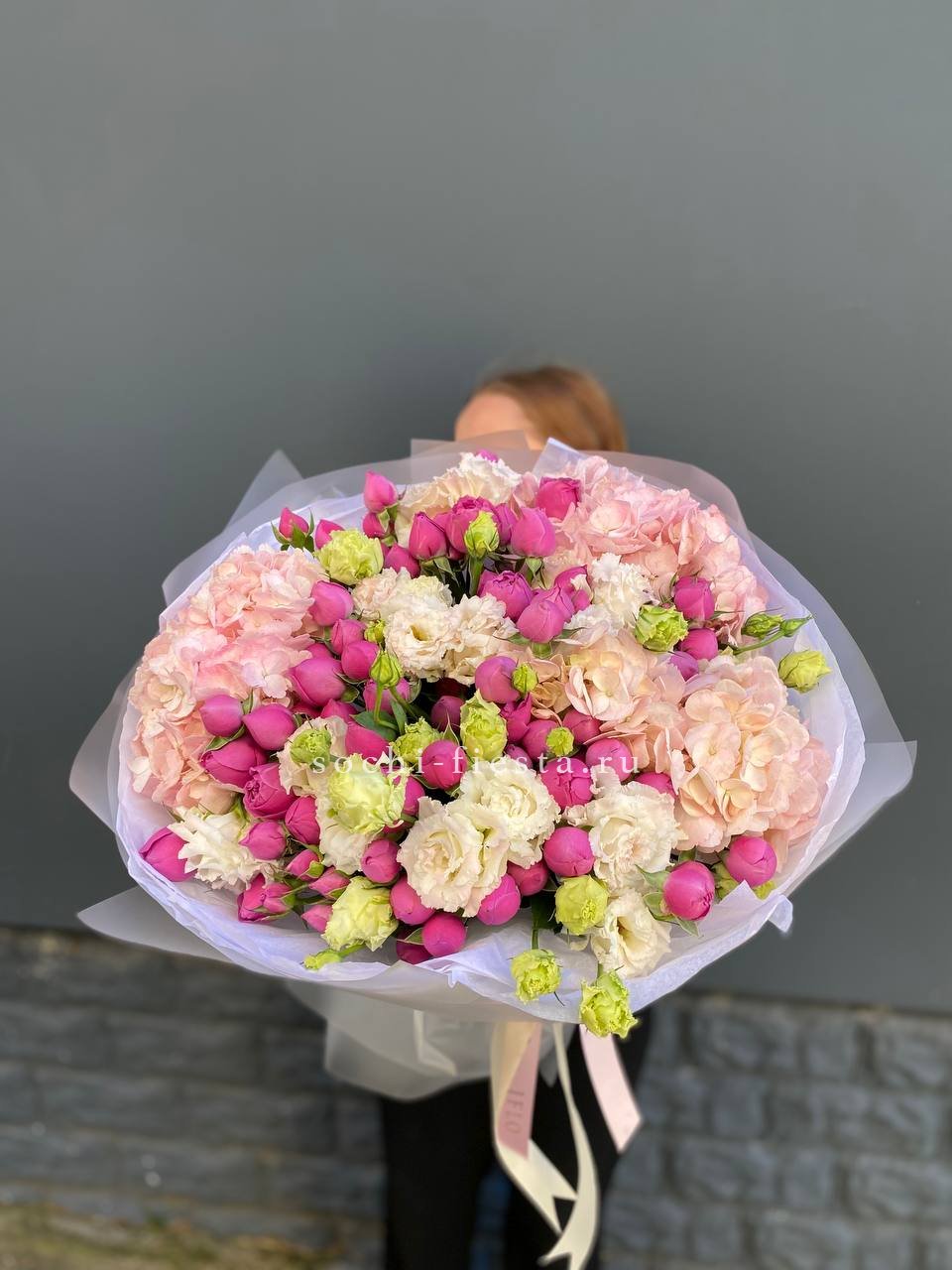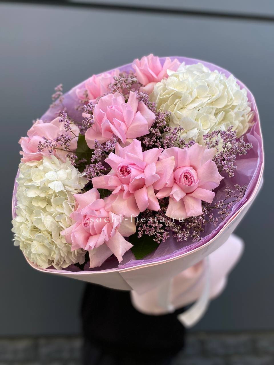 гортензия, кустовая роза, розовая роза, дельфиниум/маттиола/львиный зев, амарантус, эвкалипт или аналог, декор, корейская пленка, лента.
