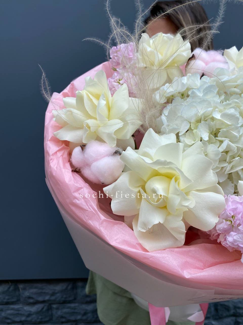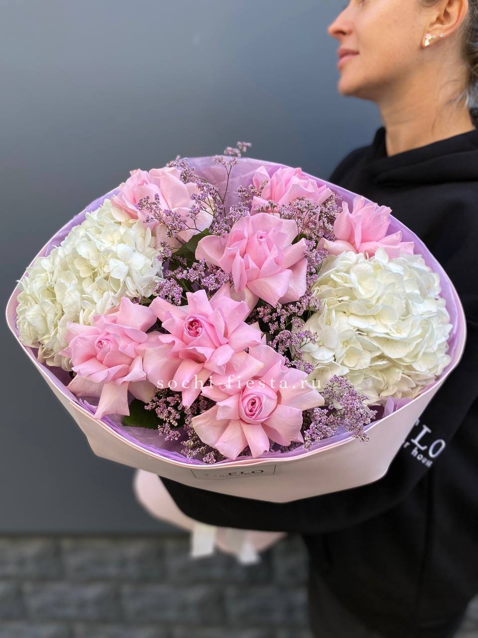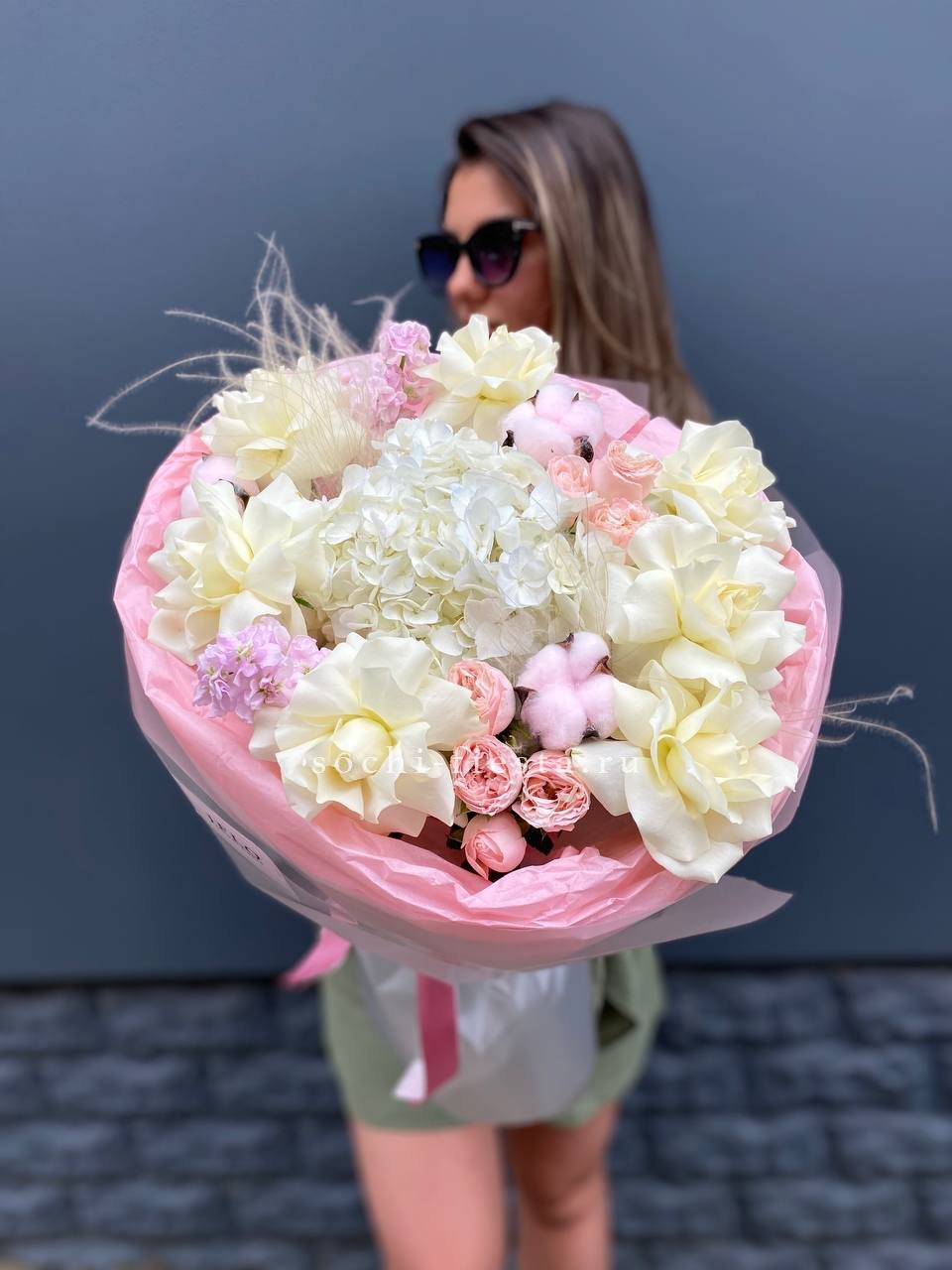гортензия, кустовая роза, розовая роза, дельфиниум/маттиола/львиный зев, амарантус, эвкалипт или аналог, декор, корейская пленка, лента.