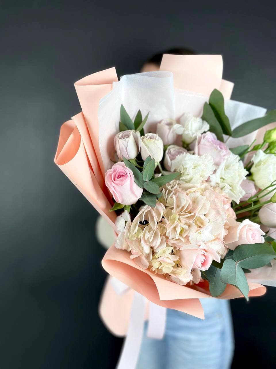 Пышные шапки гортензии задают основной объём, а бутоны роз и эустомы расставлены между ними с лёгкой небрежностью. Эвкалипт добавляет свежести и делает композицию живой.