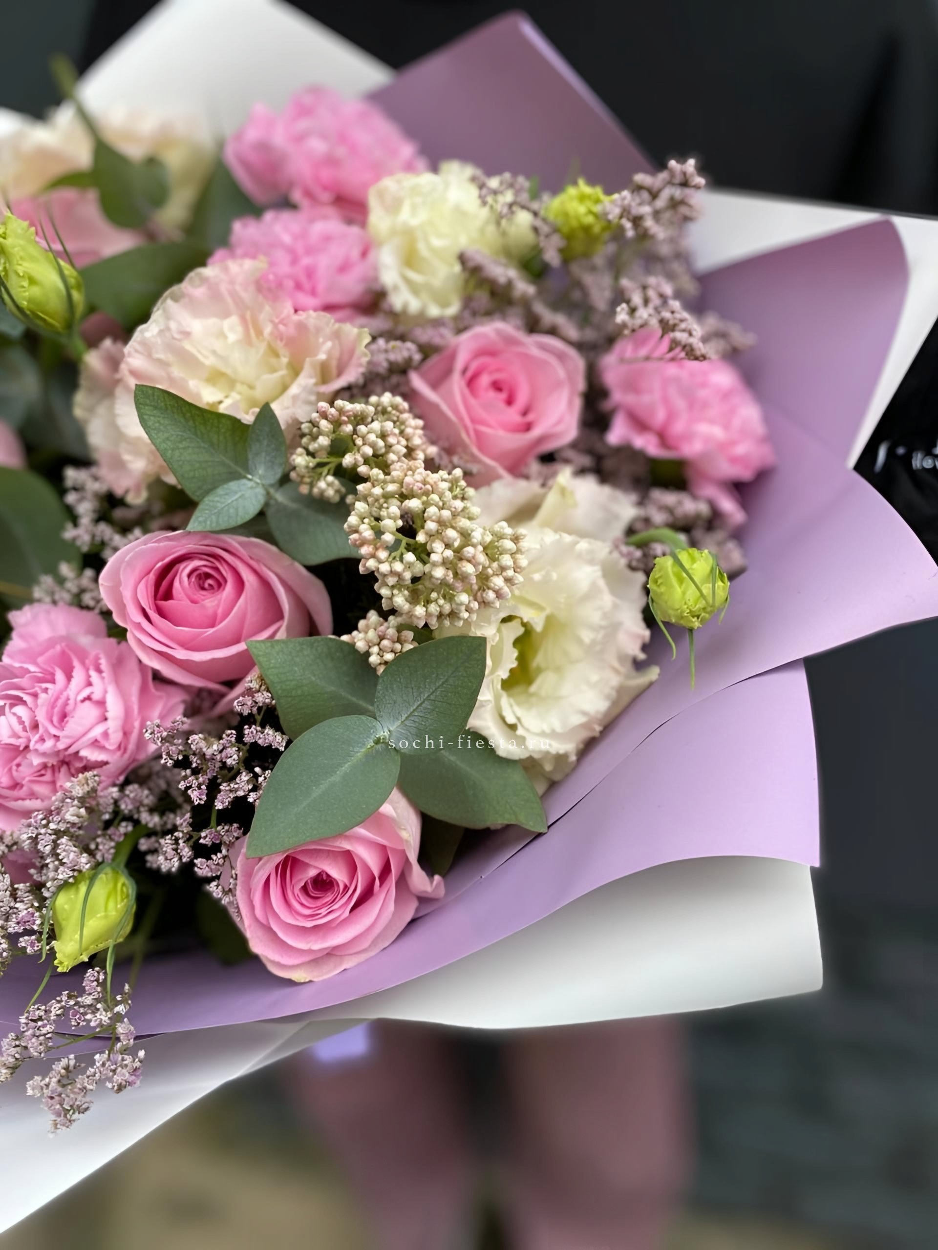 Пионовидные розы и гортензия образуют плотное ядро композиции, а диантус с эустомой разворачиваются по краям. Эвкалипт задает движение и глубину всей формы.