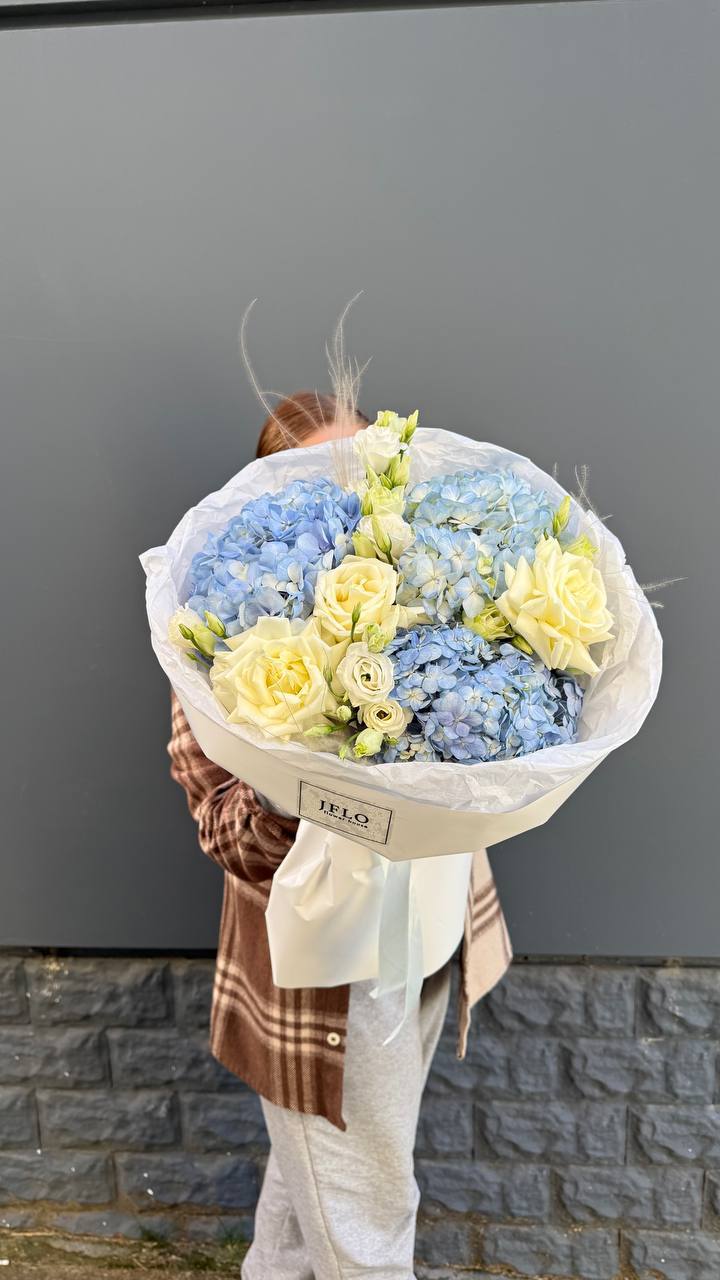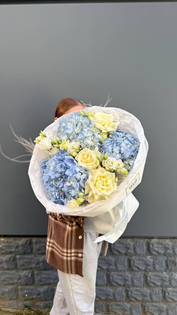гортензия, диантус, кустовая пионовидная роза, эустома, вспомогательные цветы, эвкалипт, лента, дизайнерская упаковка.
