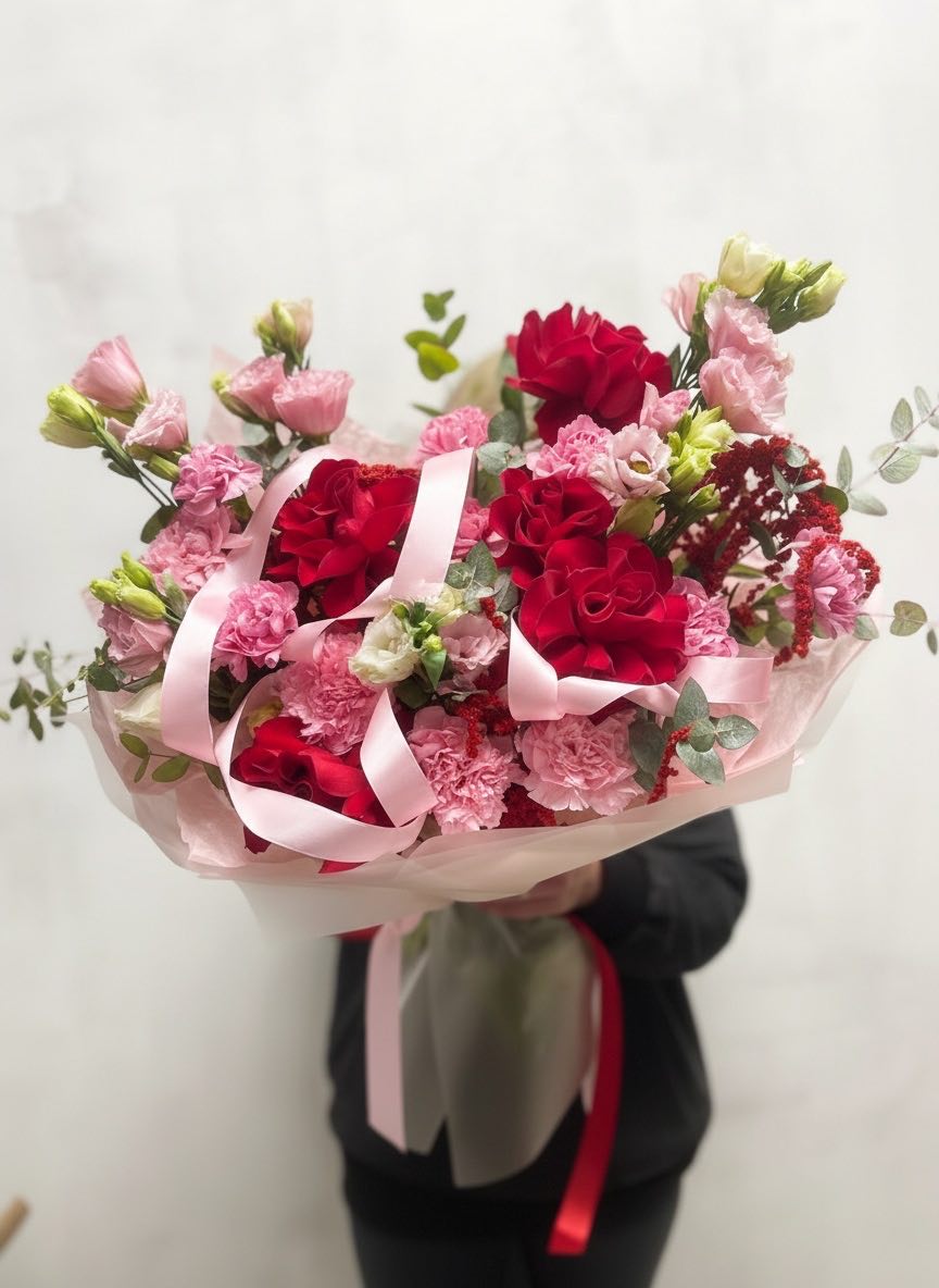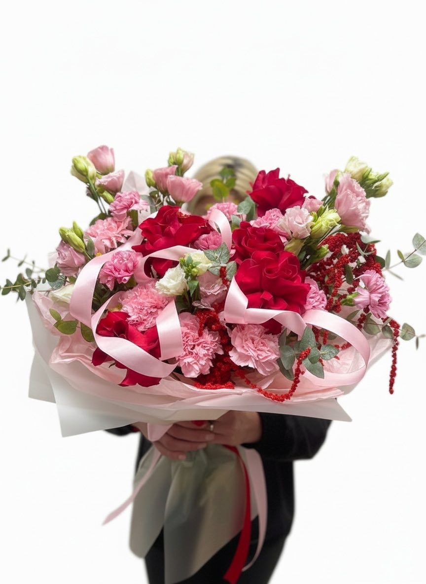 Пышная шапка из роз двух оттенков с объёмной гортензией и воздушным диантусом создаёт мягкий переход от белого к розовому. Бомбастик добавляет букету плотности, а эвкалипт освежает общую композицию. Универсальное решение для яркого поздравления.