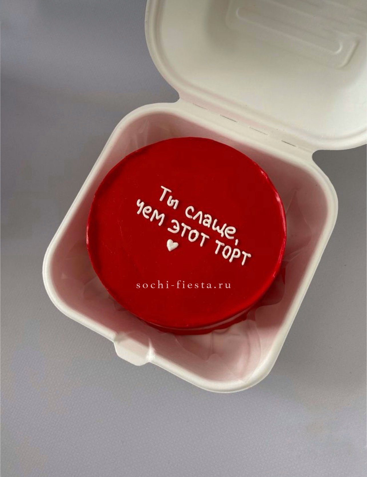 Компактный десерт ручной работы с весенним оформлением в красно-белой гамме. Кремовая текстура и графичный декор создают праздничное настроение. Два варианта начинки позволяют выбрать любимый вкус.